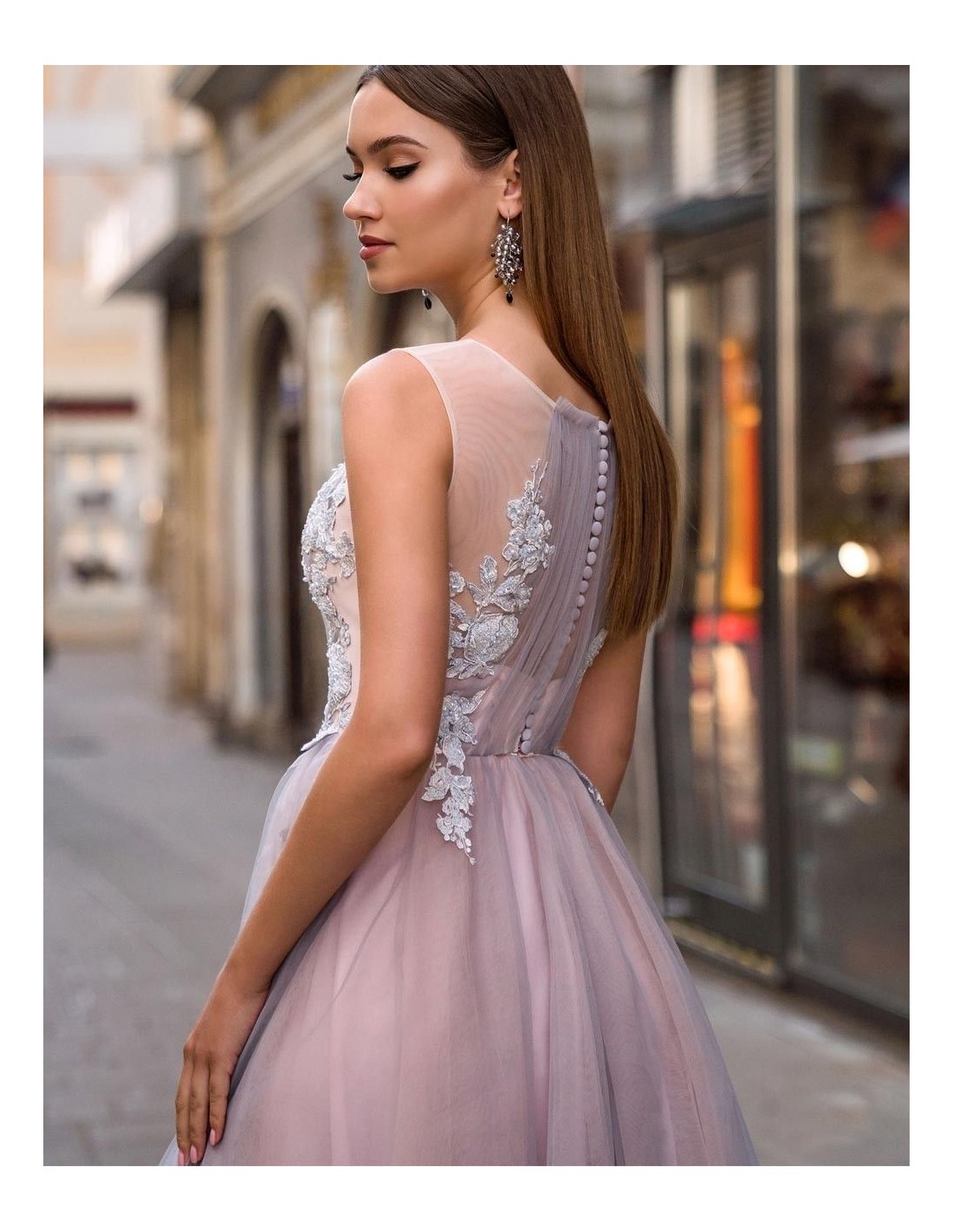 Este vestido para invitadas se presenta en tejido de tul con una combinación de tonos en rosa y morado. El cuerpo sin mangas y escote cerrado está adornado con flores bordadas en tonos pastel y cosido ligeramente plisado al centro del cuello. Se cierra en la parte trasera con botones forrados y cremallera invisible.
