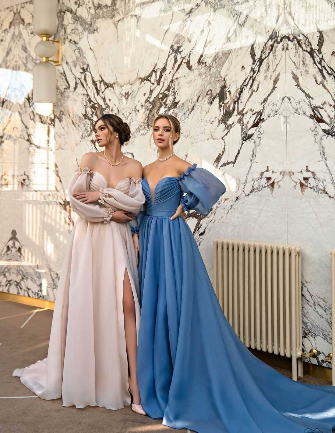 Vestido de fiesta largo con abertura lateral y manga abullonada