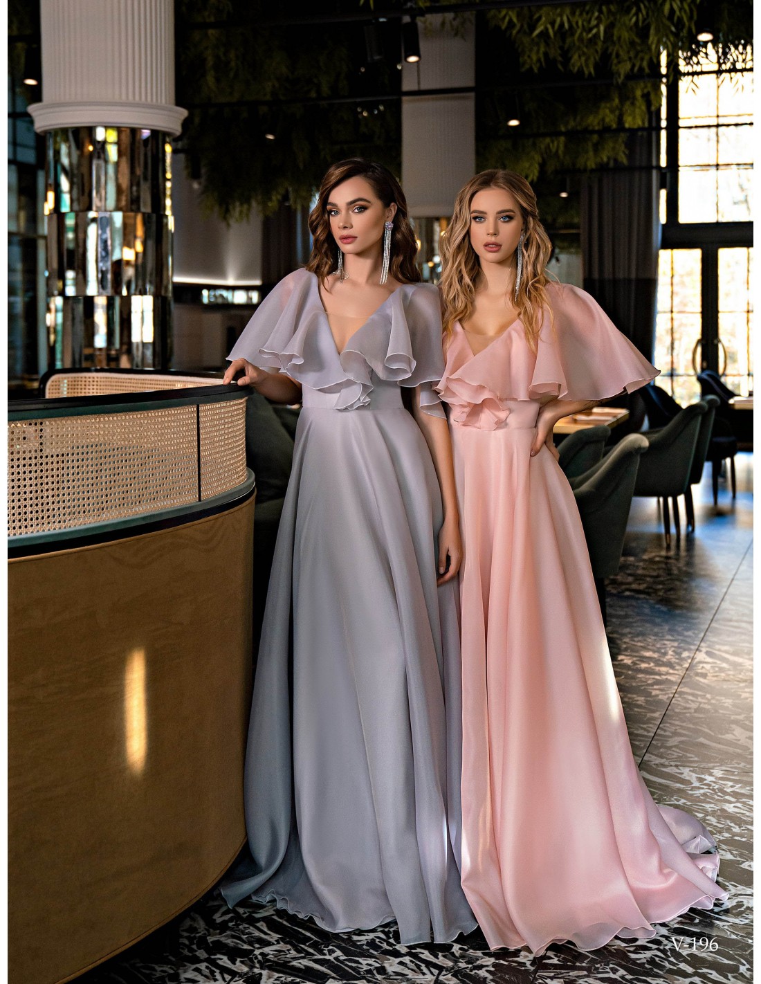 Este vestido para invitada a bodas de tarde o para hermanas de la novia se presenta en crepe disponible en gris y rosa empolvado.