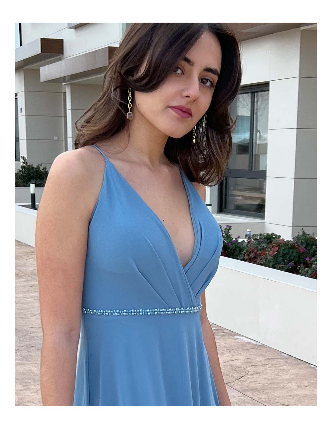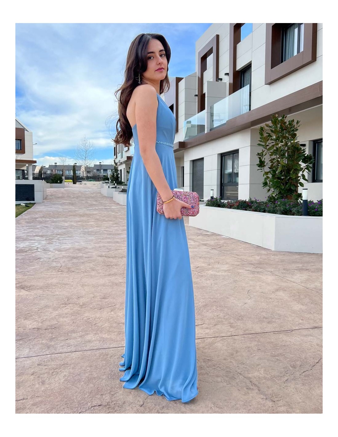 Este impresionante diseño tiene un precioso corte por debajo del pecho que estilizará tu figura adornado por una tira de pedrería del mismo tono que el tejido. Tiene una impresionante falda que se moverá con cada uno de tus pasos y te convertirá en la reina de la pista
