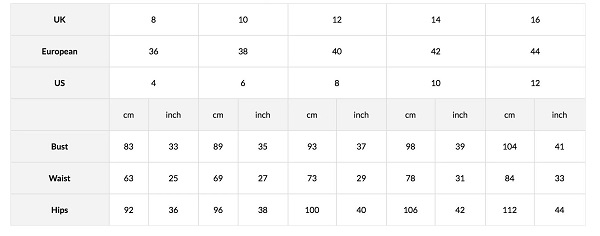 Modelo: altura: 1,78: pecho: 83 cintura: 59 caderas: 88; talla S/36