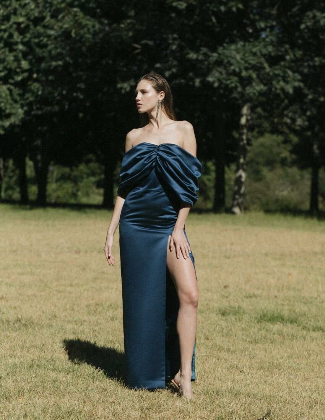 Elegante vestido largo satinado azul marino escote bardot para eventos.