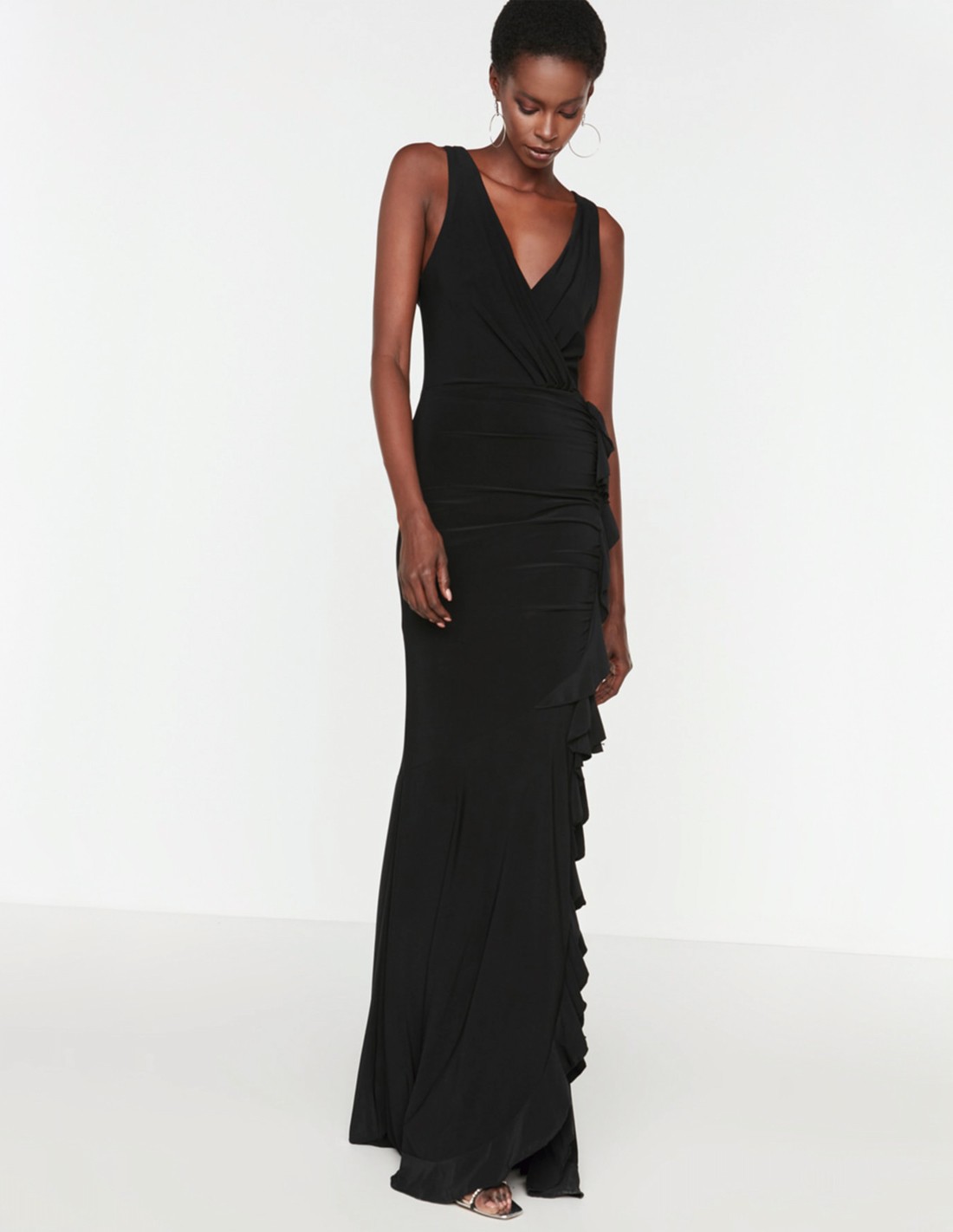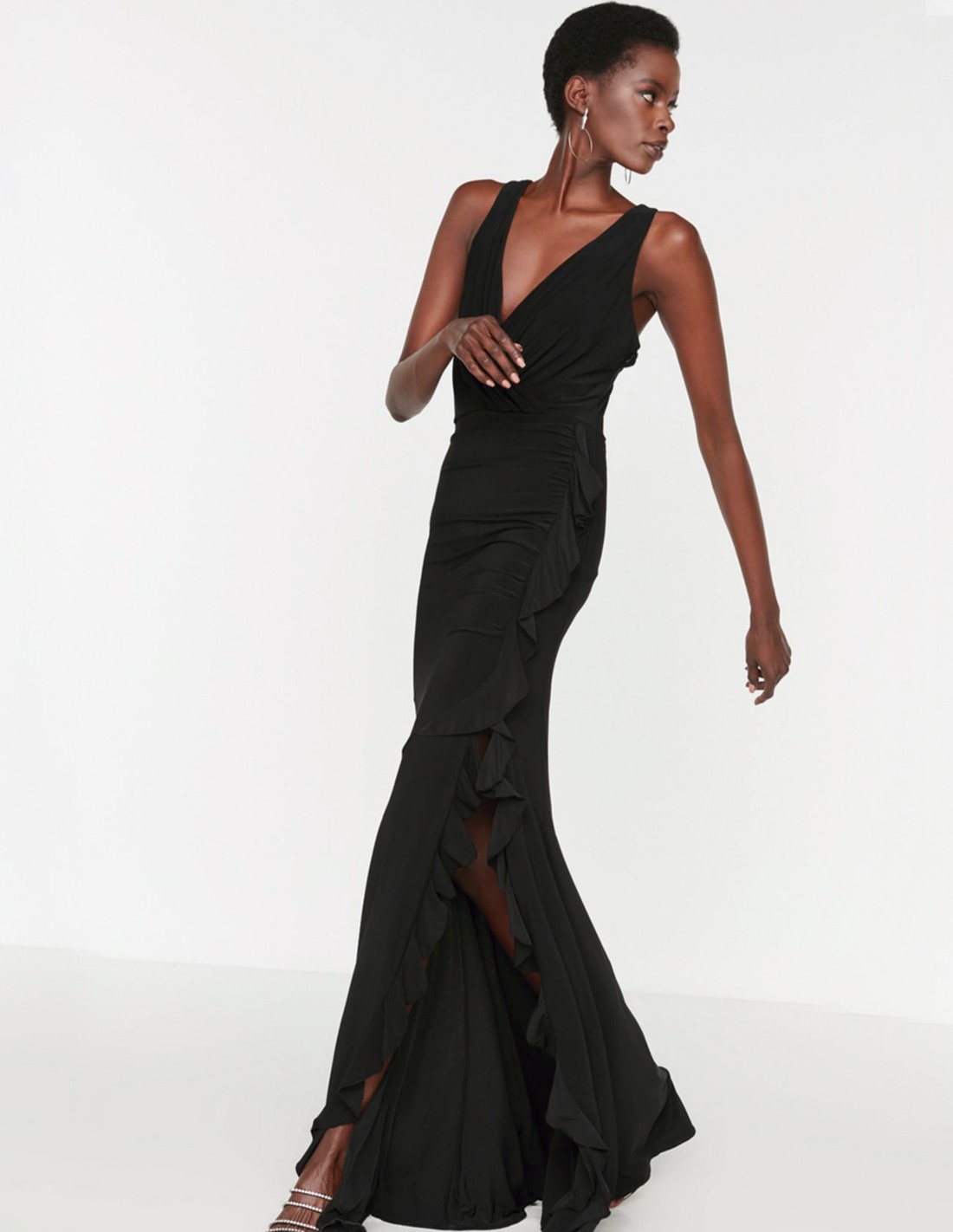Vestido de fiesta largo con escote en V y abertura en la falda con detalle de volante.