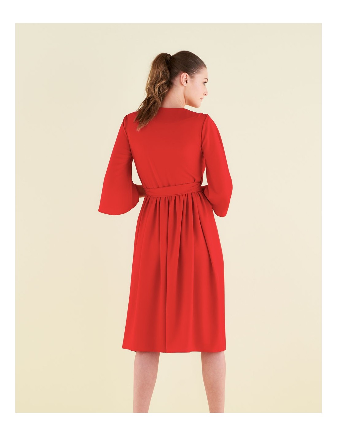 Falda sensual y femenina, que sienta debajo de la rodilla. Acabado con una manga de estilo kimono de 3/4 de longitud. Un precioso drapeados que triunfará en eventos como bodas de mañana, bautizos o cenas de empresa.