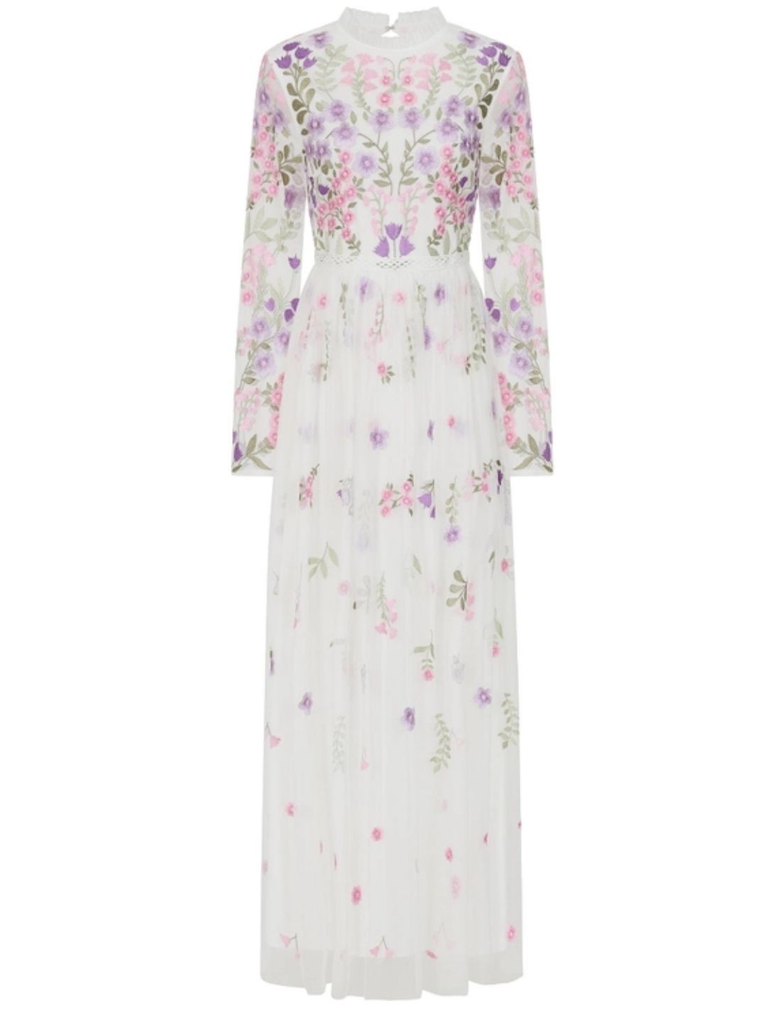 Vestido largo blanco de tul bordado de florecitas