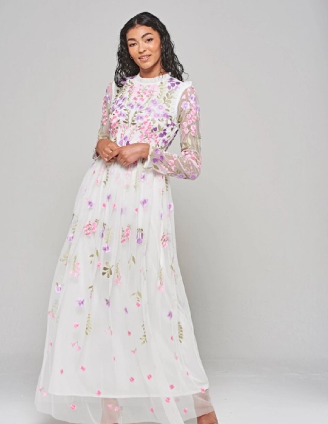 Este elegante vestido para invitadas se confecciona en un delicado crepe combinado con gasa bordada de flores de colores que aportará un toque sofisticado a cualquier ocasión especial.
