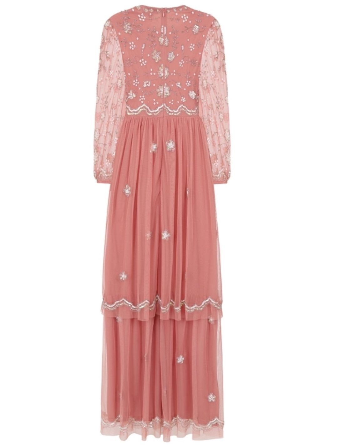 Vestido largo de fiesta con manga larga bordada de lentejuela rosa rubor para eventos de tarde como bodas de otoño.