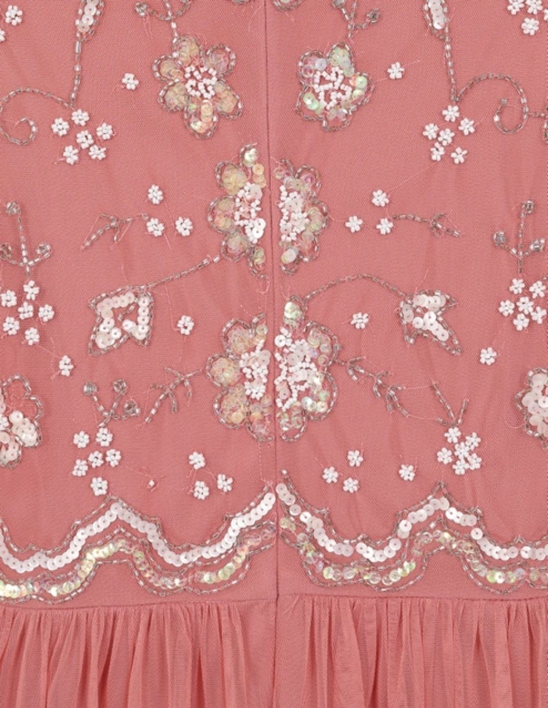 Este romántico vestido para invitadas se realiza en una base de crepé rosa rubor combinado con capas de tul salpicado en adornos florales en blanco roto a contraste. Estos detalles bordados a mano se extienden a lo largo del diseño haciendo de el una pieza única para tus ocasiones más especiales.