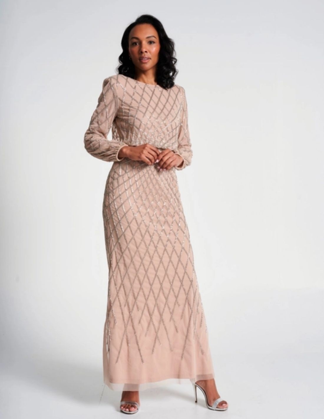 Vestido de fiesta largo con manga larga y lentejuelas nude para invitadas, madrinas y ocasiones especiales de tarde.
