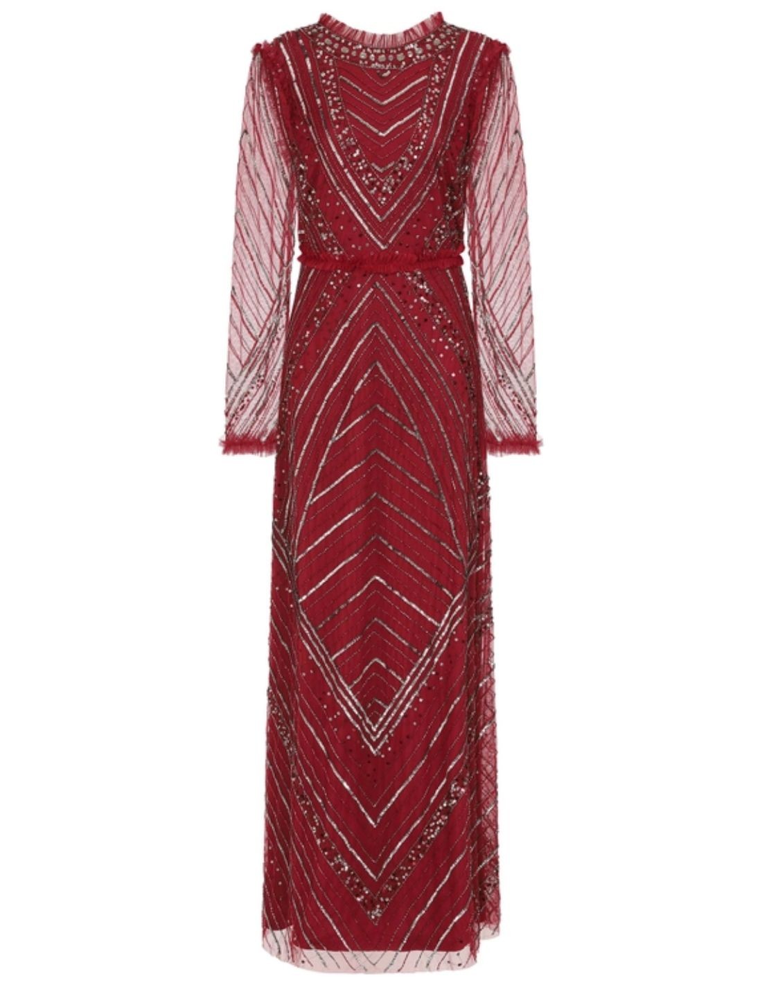 Vestido de fiesta largo granate con lentejuelas y frunces para invitadas, madrinas y ocasiones especiales.