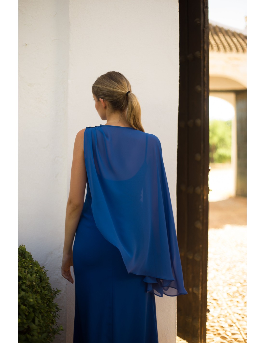 Vestido largo de fiesta con tirantes y detalle de capa a juego color azul.