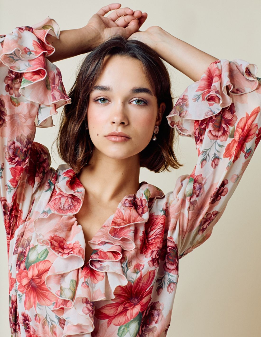 Este vestido largo de fiesta incorpora un sofisticado estampado floral en tonos tierra confeccionado en un tejido ligero de primera calidad. Los volantes le dan un toque especial al diseño tanto en el escote, como en los puños de las mangas y en el bajo.
