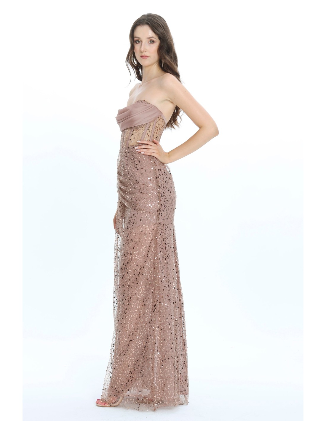 Vestido de fiesta largo con escote palabra de honor y tejido brillante
