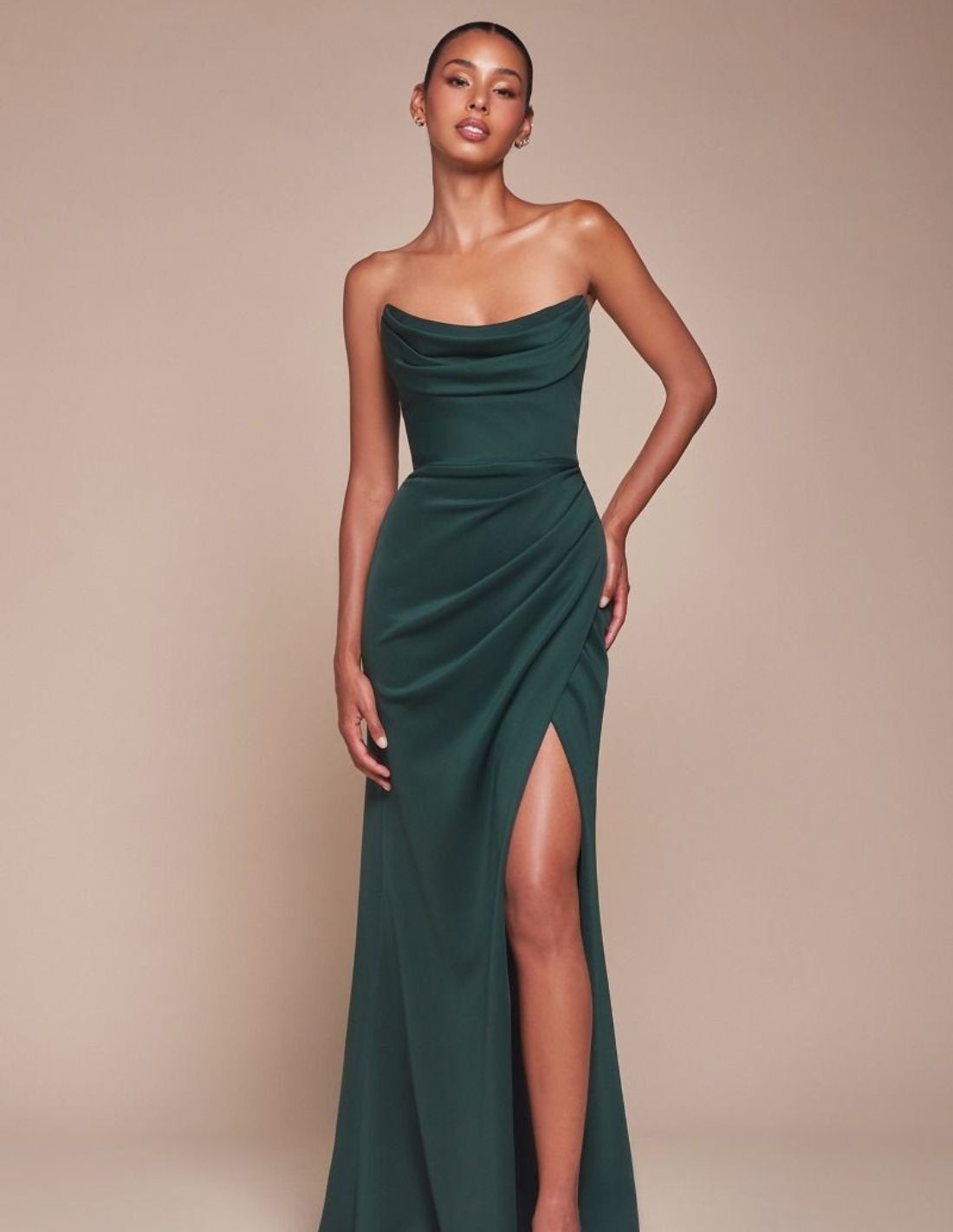 Vestido de fiesta largo con escote palabra de honor y efecto drapeado