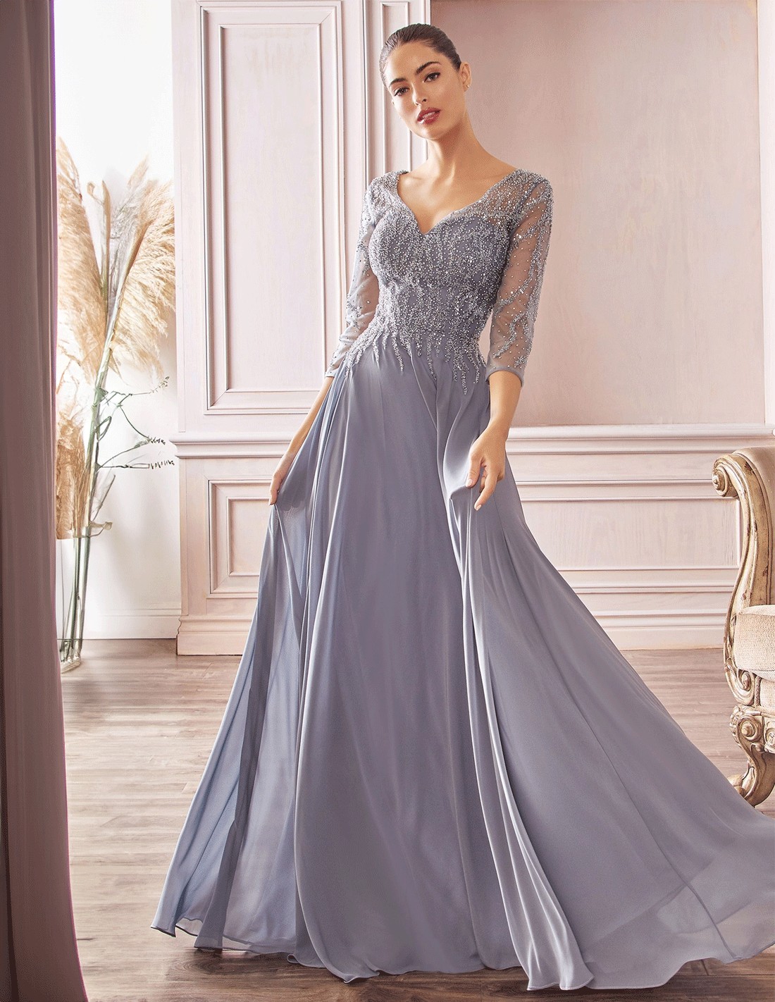 Deslumbra en cualquier evento especial con este elegante Vestido de fiesta largo con manga y cuerpo de pedrería, ideal para la Madre de la Novia o para cualquier invitada que quiera llevar manguita en su evento especial.