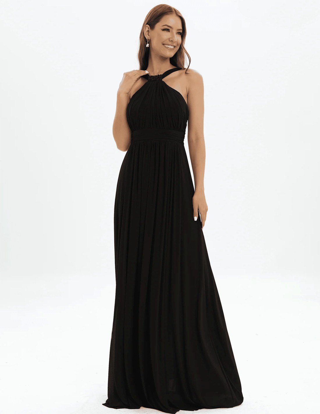 Vestido largo de fiesta con escote halter y detalles de pedrería