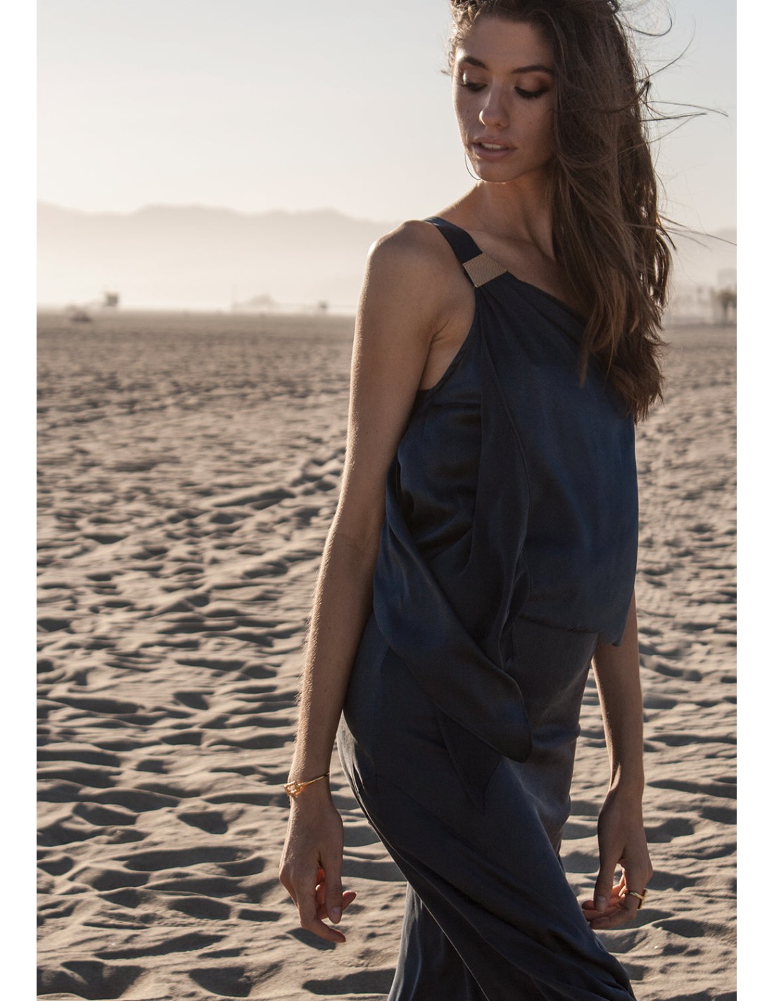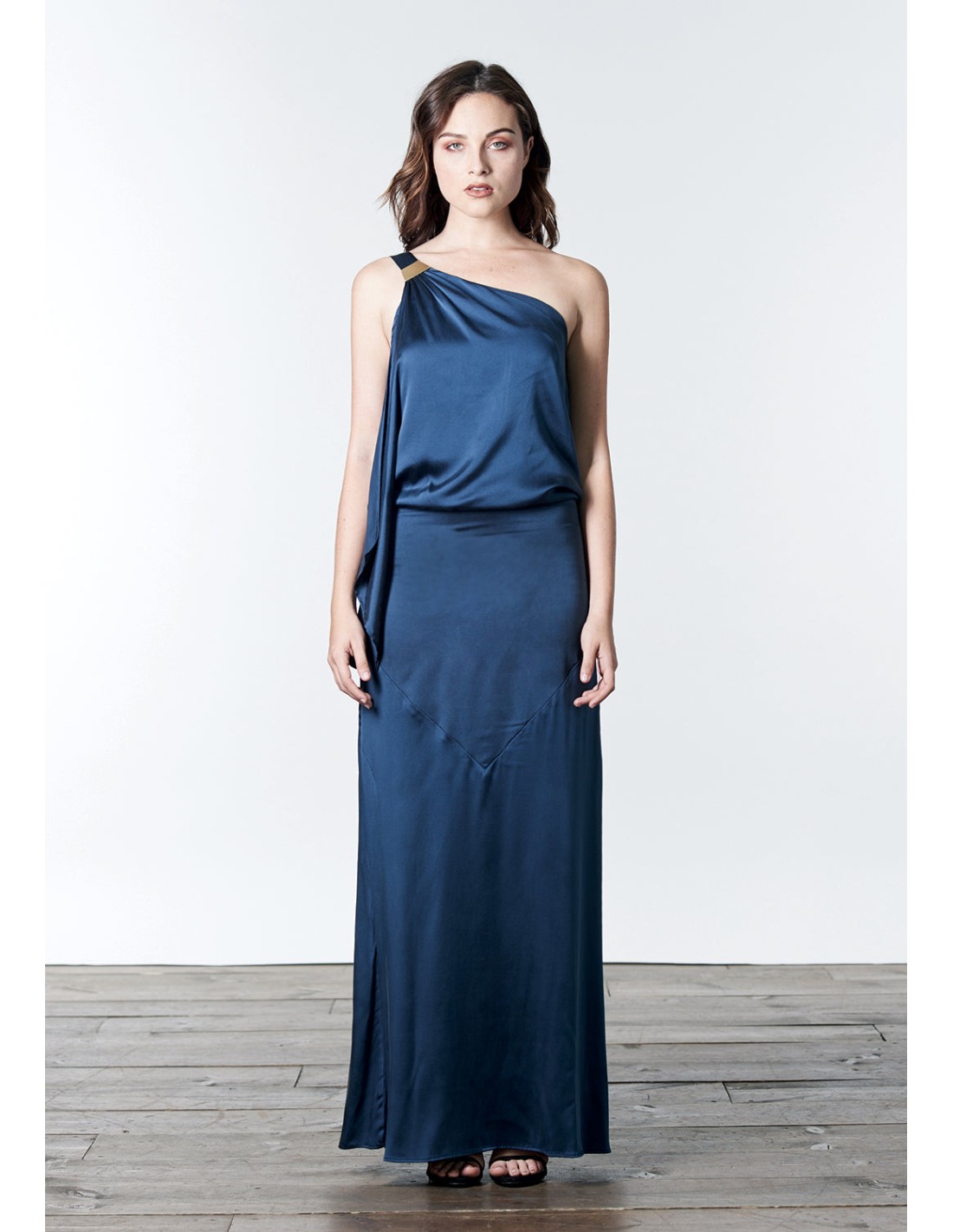 Este vestido largo de satén elástico, con detalles drapeados en la falda, con escote asimétrico y detalle dorado en el tirante que aporta un toque original, será un acierto. Un vestido cómodo y sencillo, perfecto para cualquier ocasión especial, e incluso para novias civiles, como segundo vestido o para una pedida.