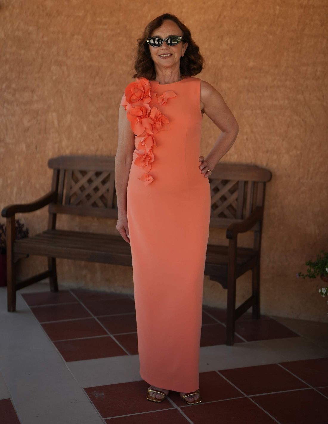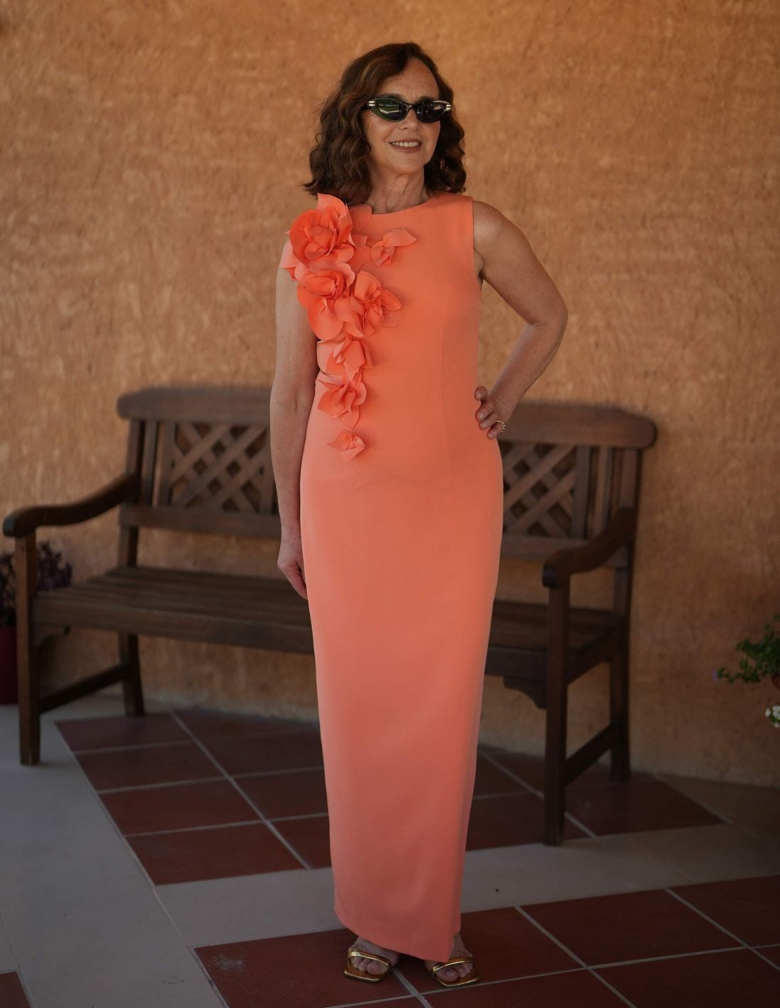 Vestido largo con escote cerrado y detalle de flor