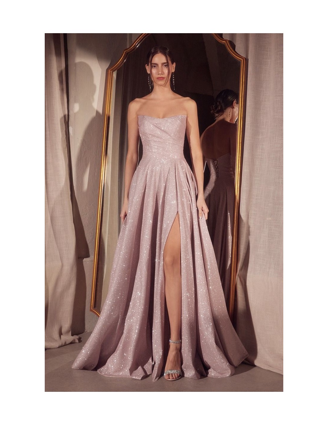 La falda plisada con vuelo de este vestido de invitada con una sutil abertura lateral añade un toque de dramatismo, mientras que la espalda corset con lazo ajustable garantiza un ajuste perfecto y realza la figura. Confeccionado en un tejido con destellos de brillo, este vestido es la elección ideal para bailes de graduación, bodas y eventos formales.