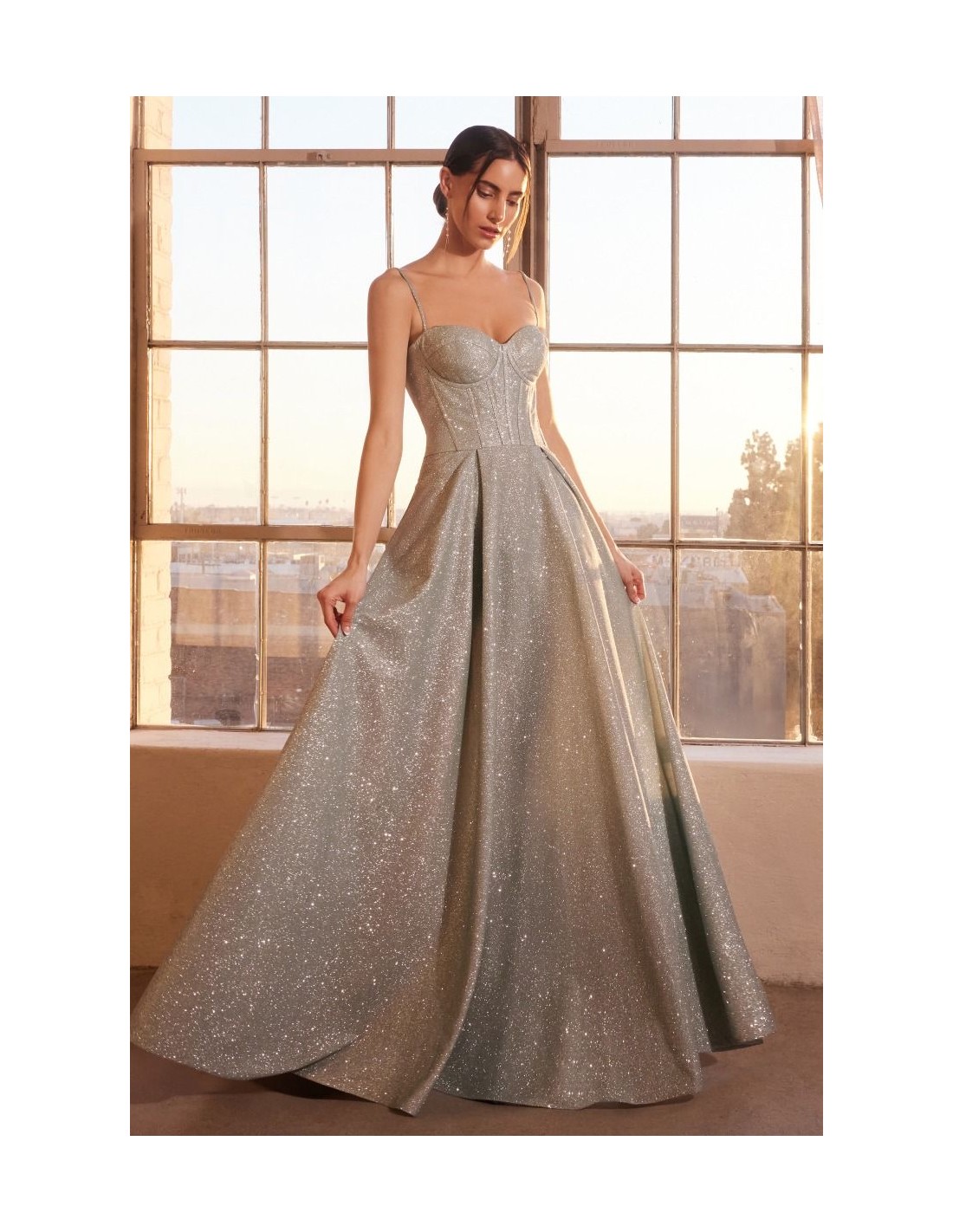 Vestido de fiesta con tejido brillante y cuerpo tipo corsé con falda de vuelo
