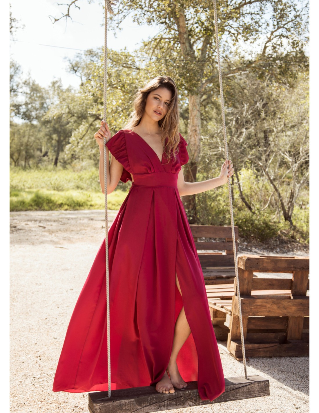 Este impresionante vestido largo cereza es la elección perfecta para brillar en cualquier evento especial. Su diseño sofisticado destaca por los delicados volantes en los tirantes, que aportan un toque romántico y femenino. El escote pronunciado realza la silueta, mientras que el corte entallado en la cintura estiliza y define la figura.