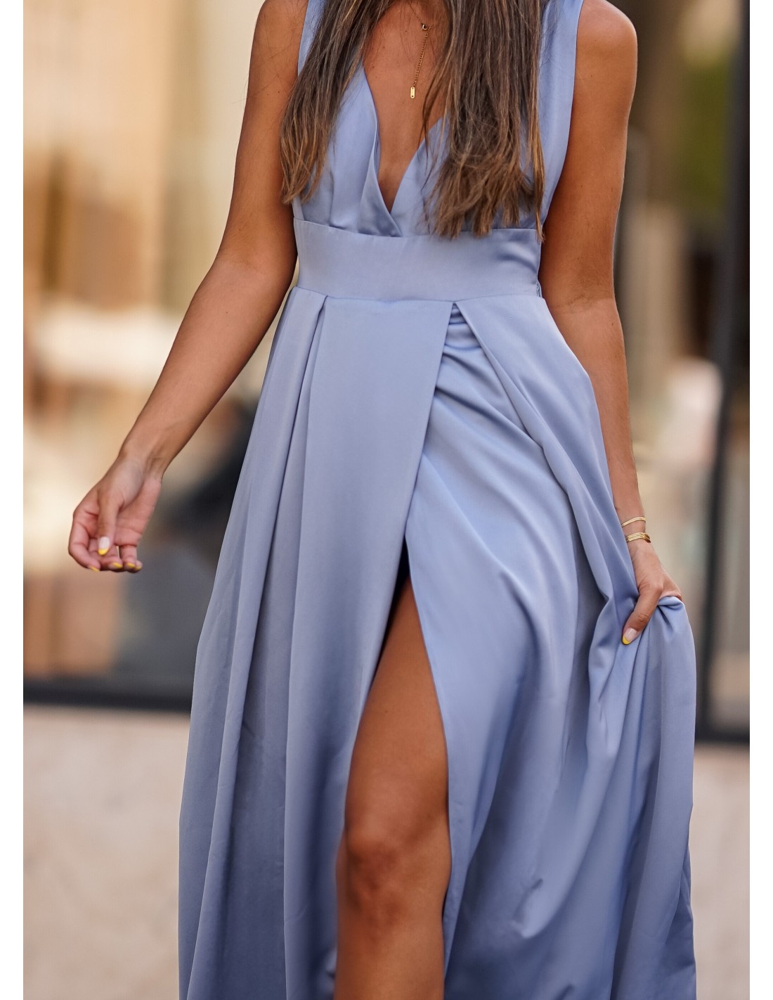 Vestido largo azul con escote pronunciado y apertura