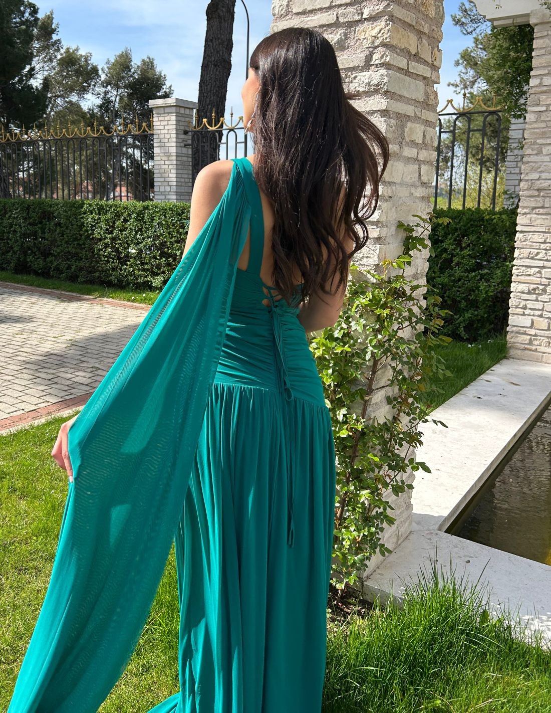 Vestido de invitada boda largo con cuerpo drapeado y manga capa