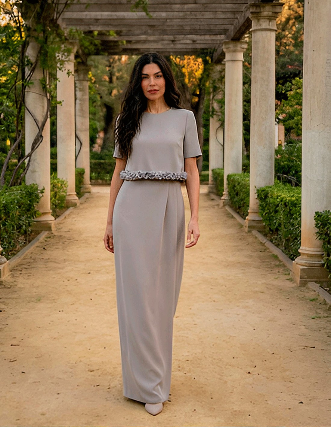Un elegantísimo conjunto de dos piezas compuesto por vestido y top realizado en el más exquisito crepé. Este Vestido de fiesta largo de tirante ancho con sobrecamisa es perfecto para invitadas especiales. La silueta de este vestido abraza la figura femenina y lo convierte en una elección elegante y atemporal para madrinas, hermanas de la novia o el novio o invitadas que deseen ir elegantes.