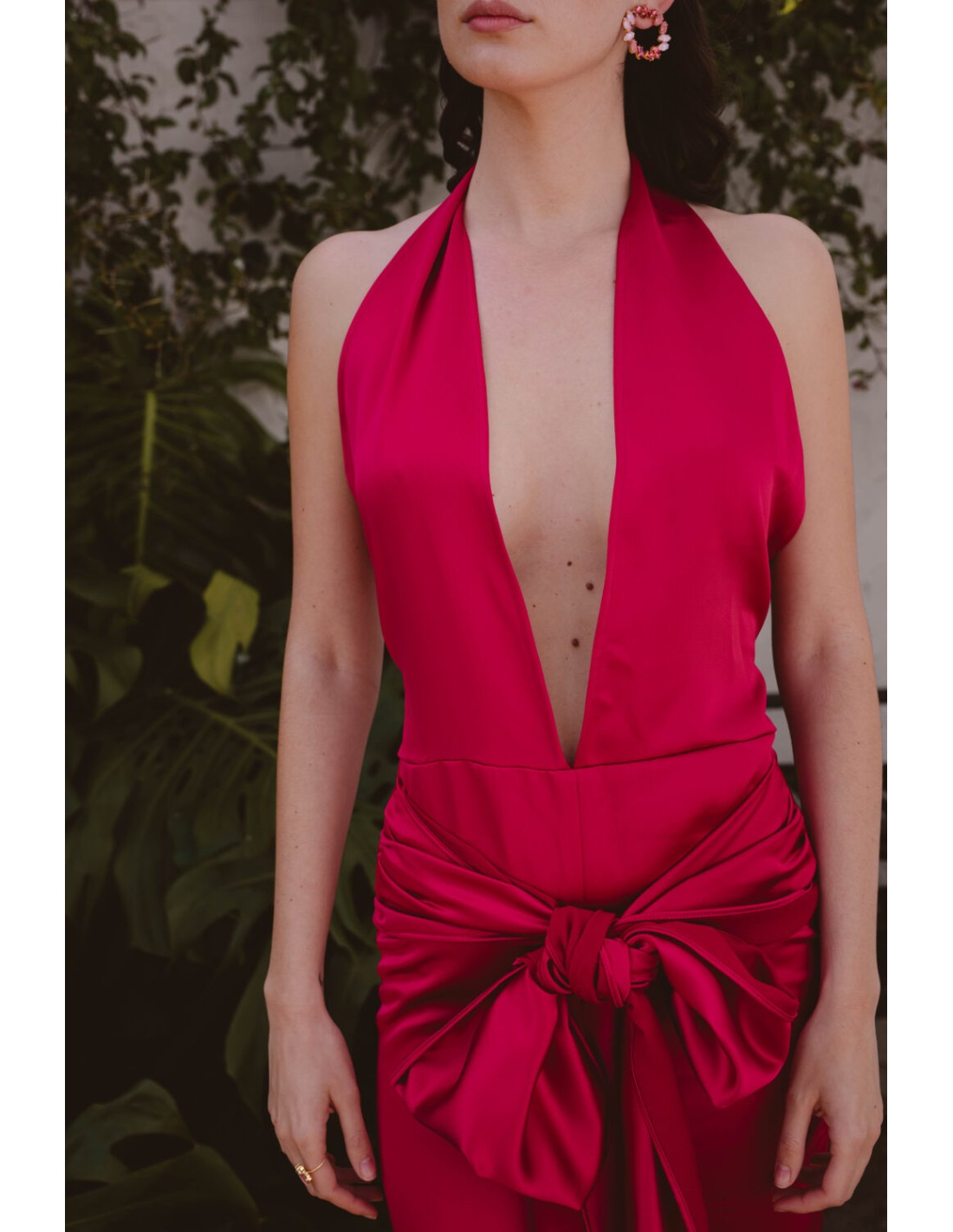 Destaca en tus eventos más especiales con este espectacular vestido de fiesta largo fucsia. Su diseño incorpora una maxi lazada en la cintura que realza la silueta, una raja delantera que aporta movimiento y sensualidad, y un gran escote en pico anudado elegantemente al cuello, creando un look femenino y sofisticado.