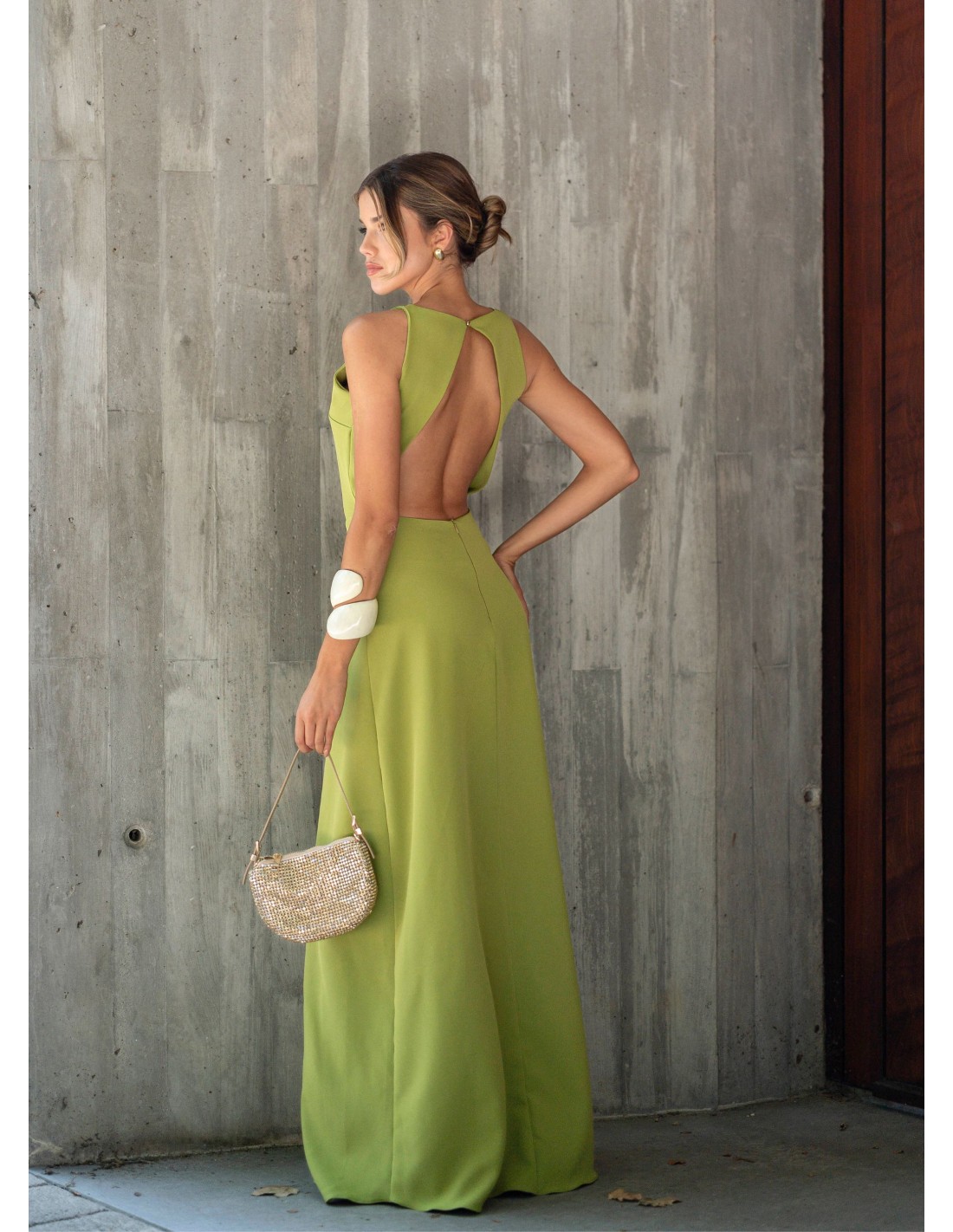 Deslumbra en cualquier evento con este vestido largo verde lima, diseñado para quienes buscan elegancia con un toque atrevido. Su escote tipo barco en la parte frontal contrasta con una espalda completamente descubierta, creando un efecto sofisticado y sensual.