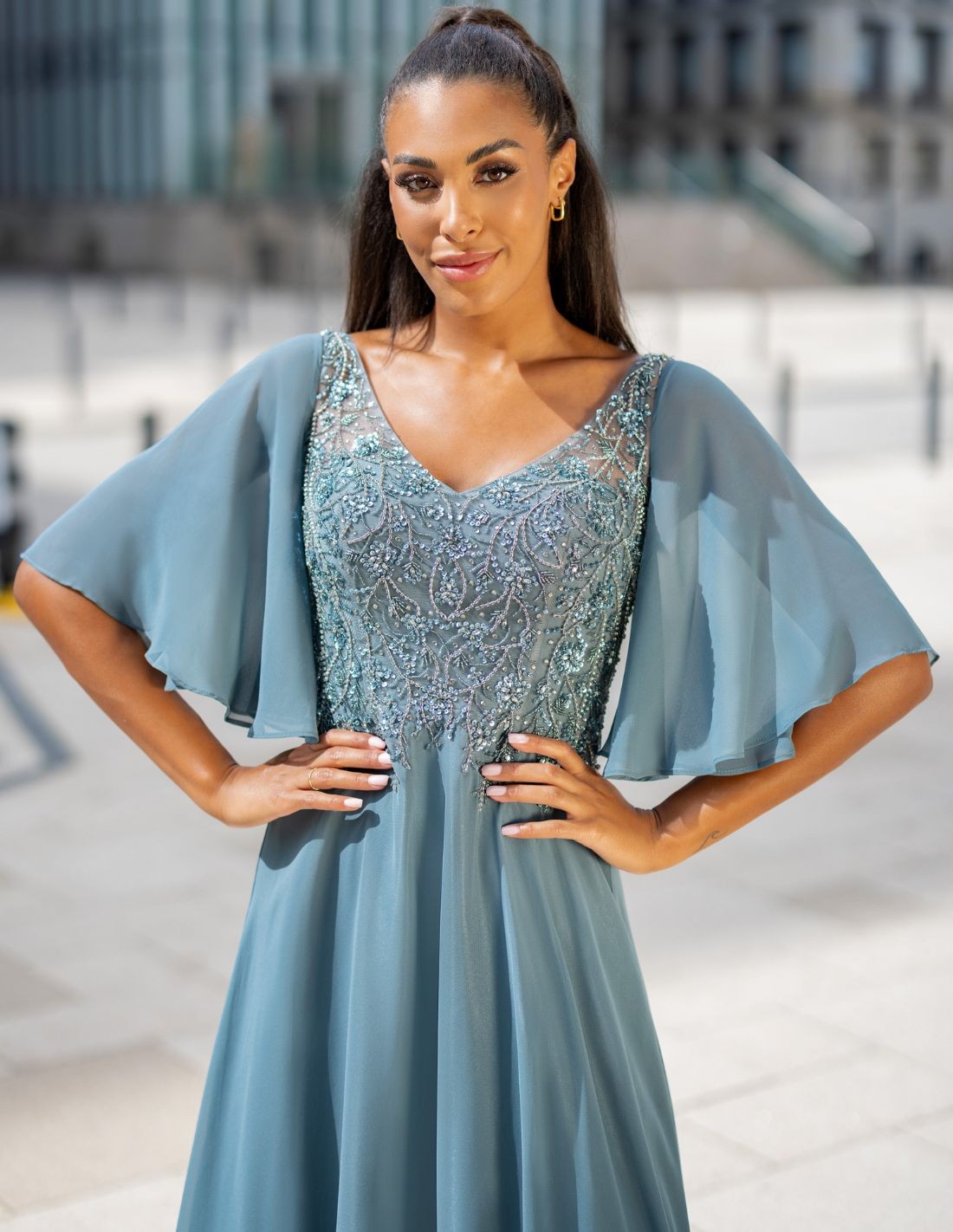 Un diseño muy especial que podrás lucir si eres dama de honor, hermana de la novia o el novio o invitada de tarde. Este vestido largo de invitada será ese diseño que dejará con la boca abierta a todos. Confeccionado con escote en V poco pronunciado y con manga corta de murciélago. La parte de arriba realizada con pedrería, aporta elegancia y sofisticación. La caída de la falda, muy sutil y favorecedora, ¡te hará brillar!