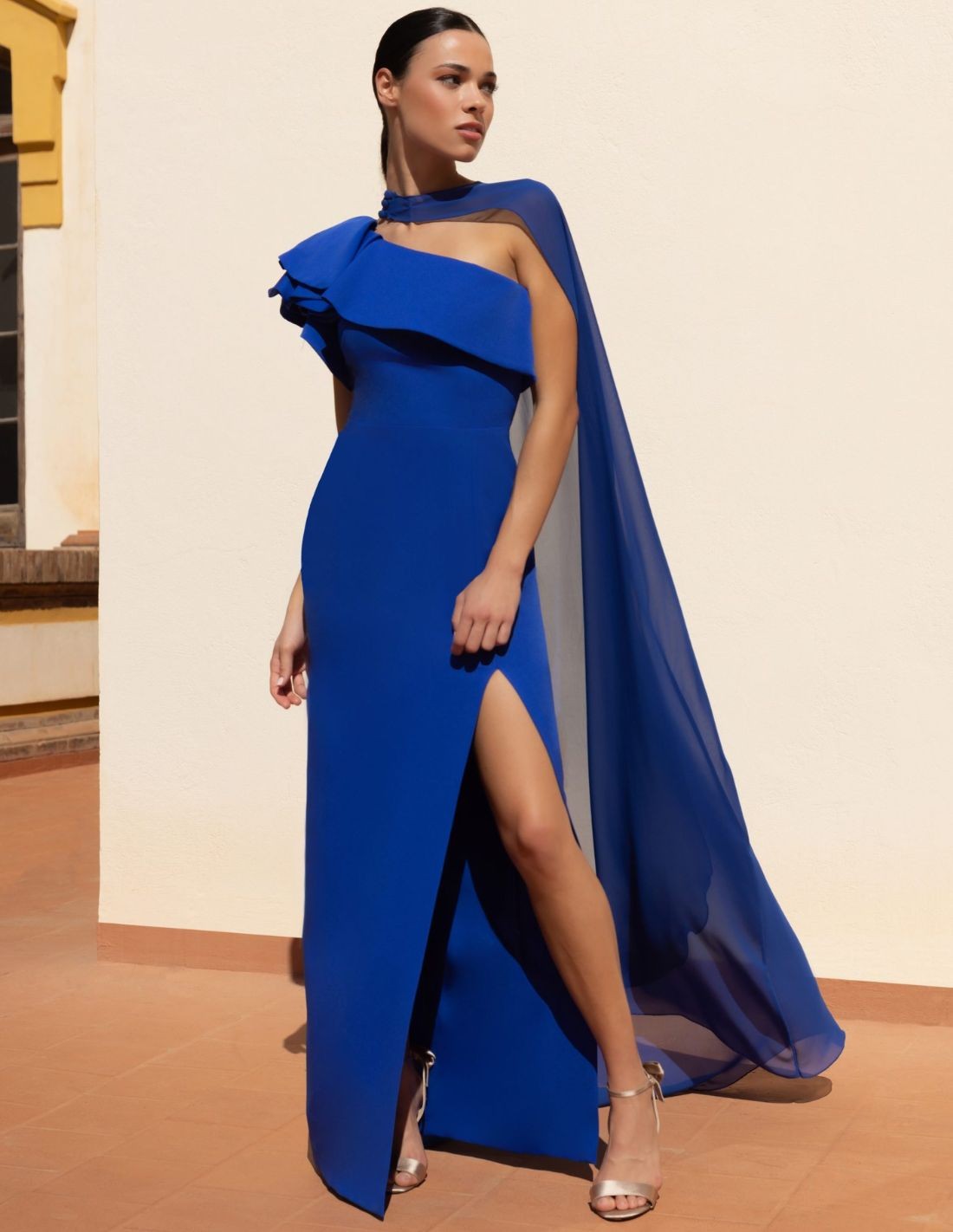 Vestido largo con escote asimétrico y volante