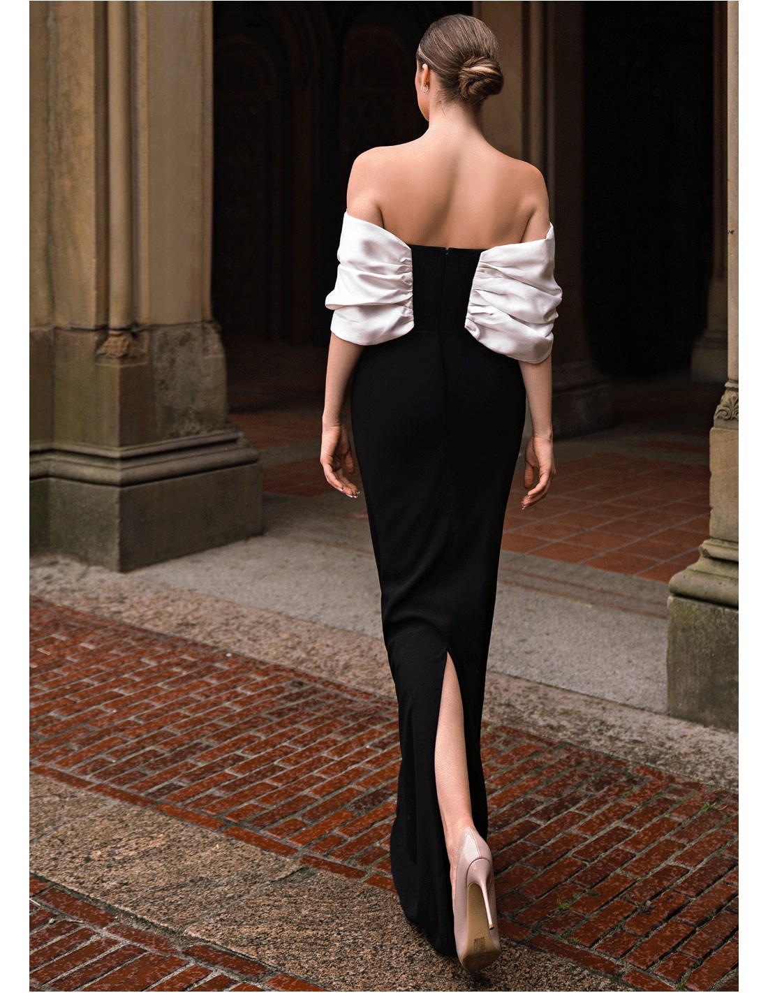 El gran lazo blanco satinado sobre el escote añade un toque escultórico y distintivo, aportando volumen y contraste visual que enmarca los hombros de manera sublime. Confeccionado en un tejido estructurado y fluido, este diseño garantiza una caída impecable y una presencia impactante en cada movimiento.