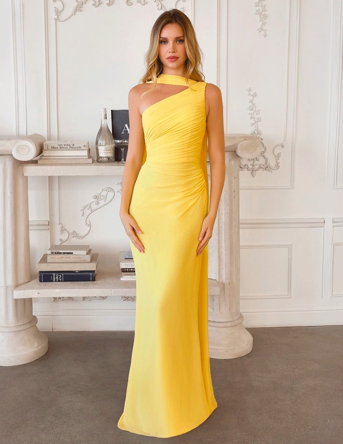 Este Vestido de fiesta largo amarillo pastel es una opción luminosa y delicada para invitadas que buscan elegancia sin artificios. Inspirado en el estilo griego, su escote asimétrico de un solo hombro aporta un aire sofisticado y actual.