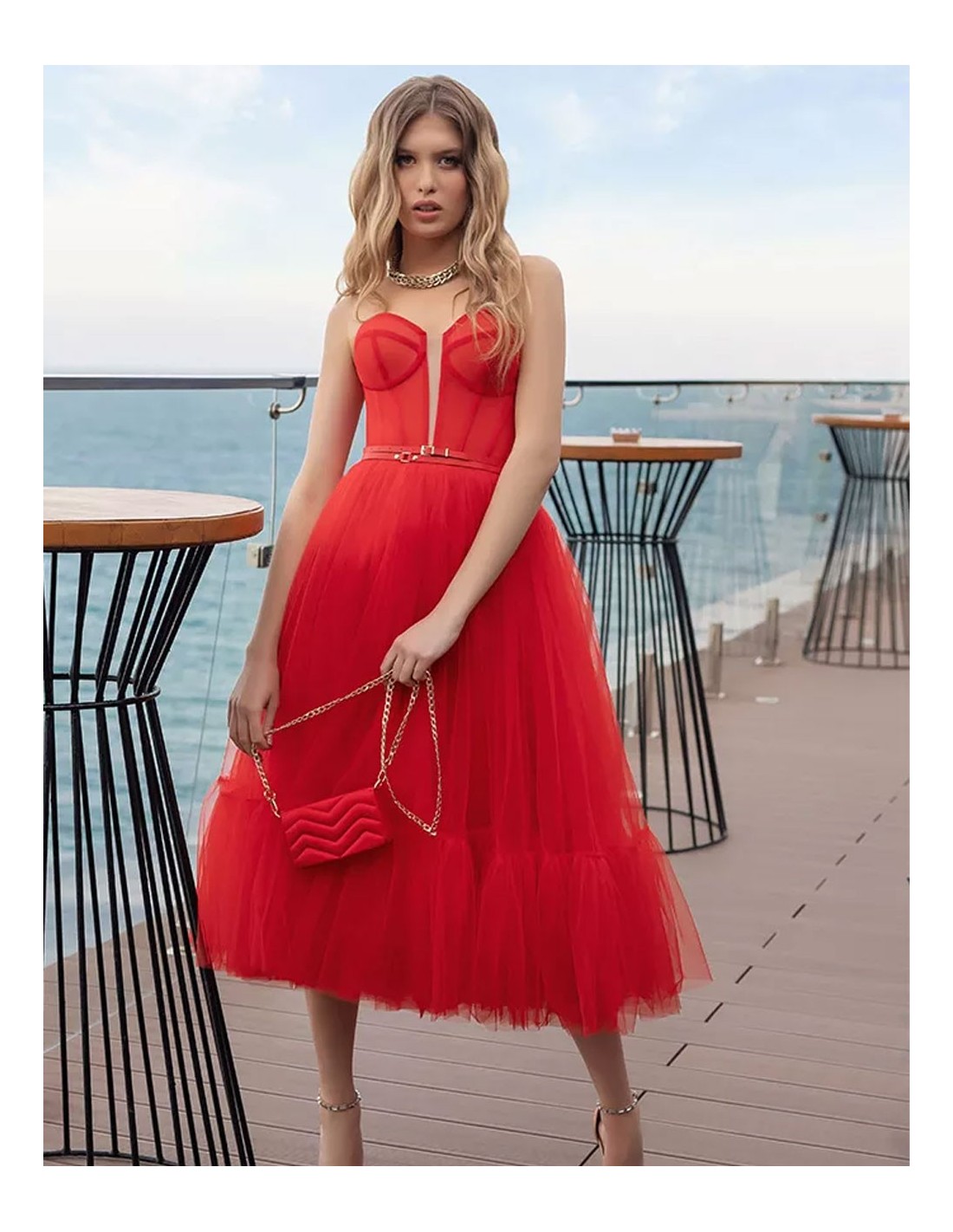 Vestido de fiesta rojo palabra de honor con falda de tul