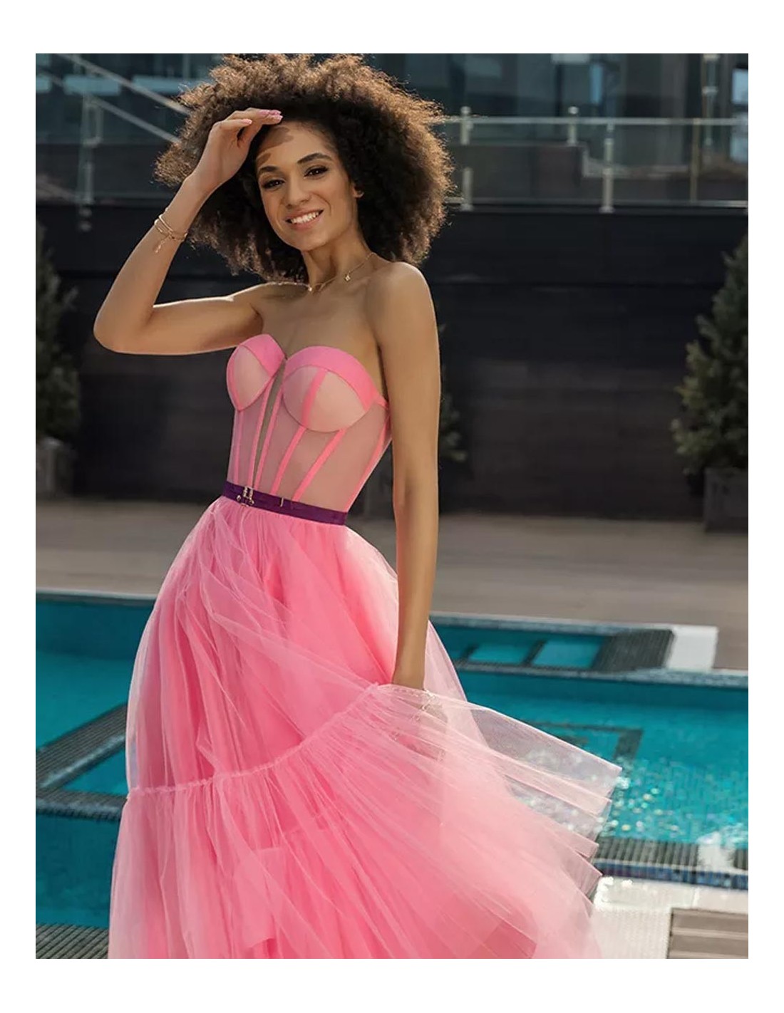 Vestido de fiesta midi rosa chicle realizado en tul con escote corazón