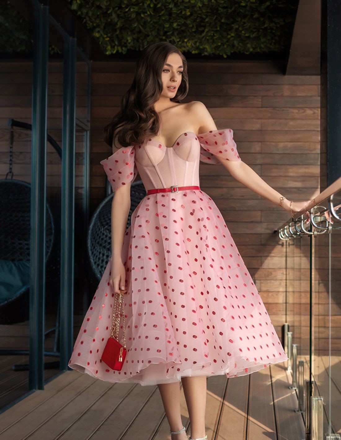 Vestido de fiesta midi de tul con detalle topos y cuerpo corsé para eventos especiales.