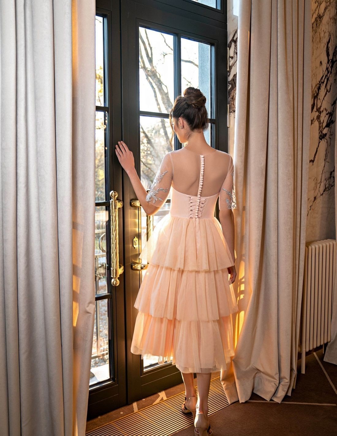 Vestido midi con capas de tul y cuerpo bordado para eventos de mañana.