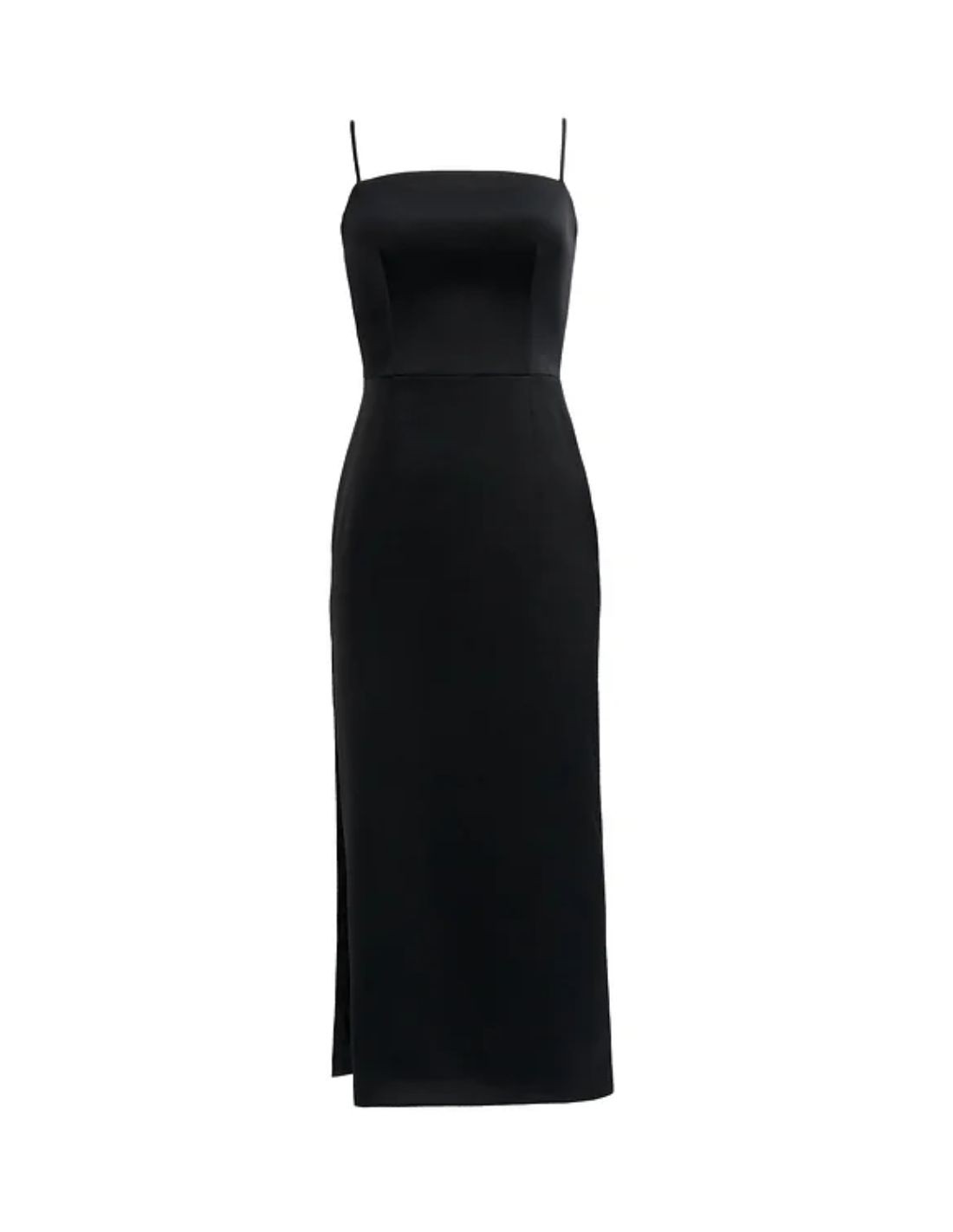 Elegante y favorecedor vestido midi de fiesta negro con tirantes y abertura lateral para invitadas o looks casual.