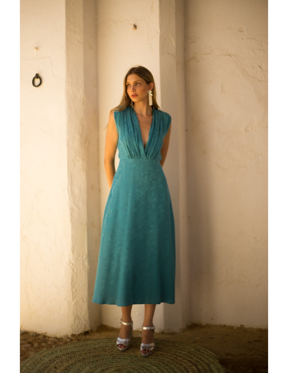 Vestido de fiesta midi en tejido jacquard con escote en V color turquesa.