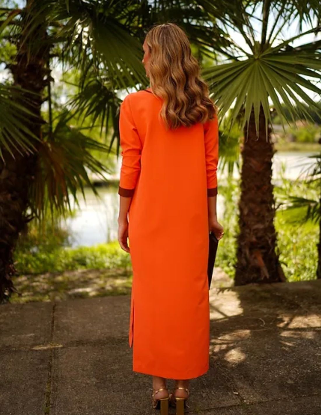 Vestido de invitada estilo Kaftán naranja con detalles en negro
