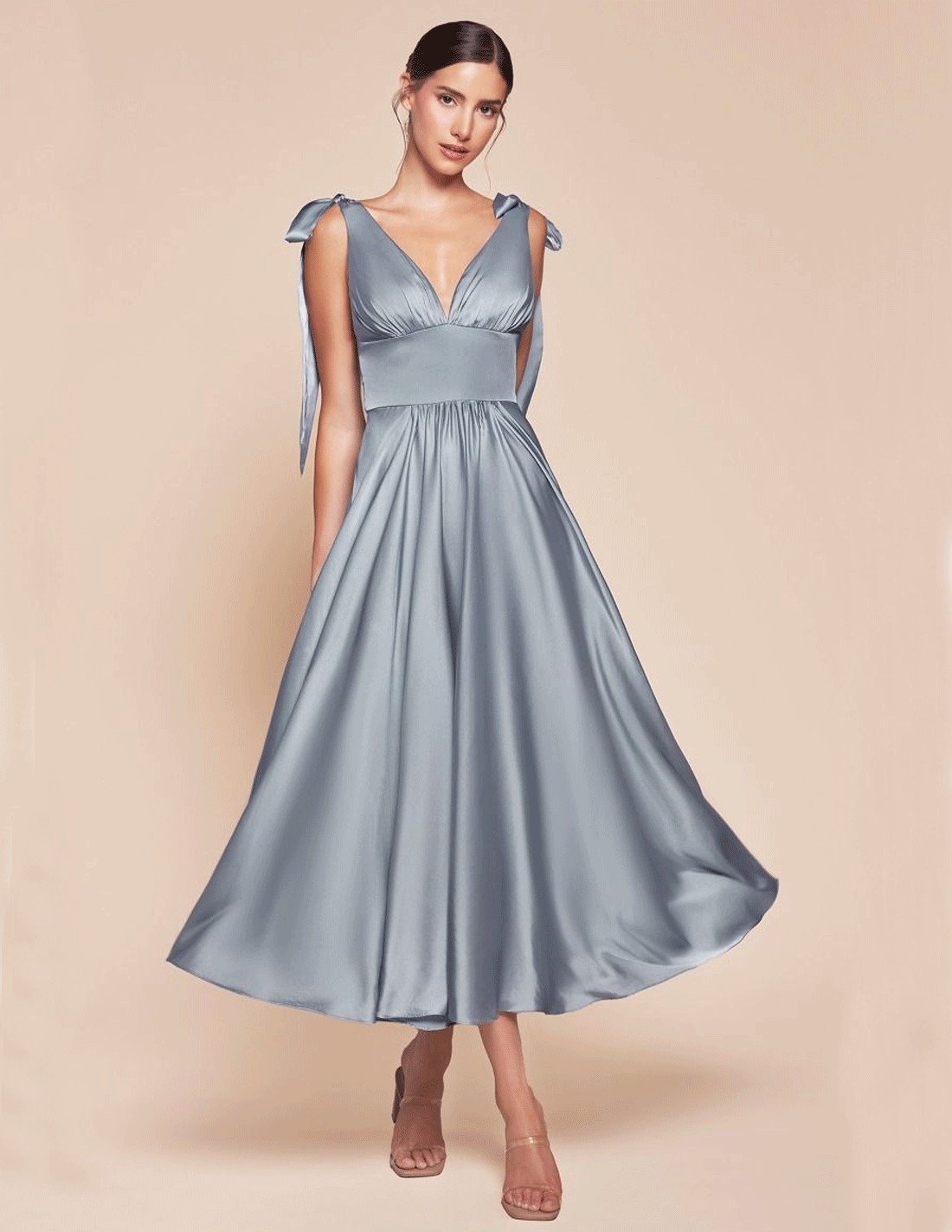 Destaca con sofisticación con nuestro impresionante Vestido de fiesta midi de satén con falda de vuelo, diseñado para la invitada moderna y elegante.