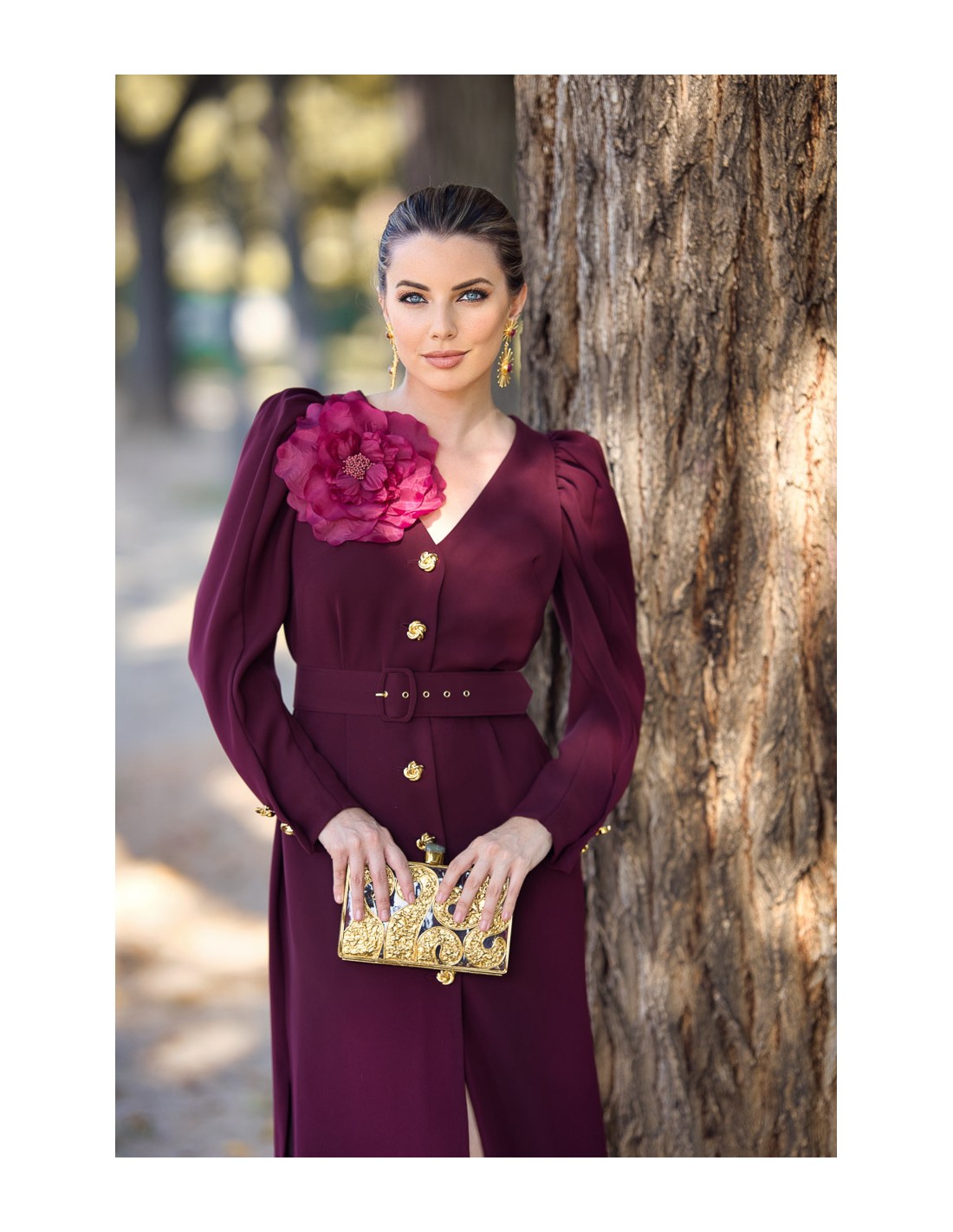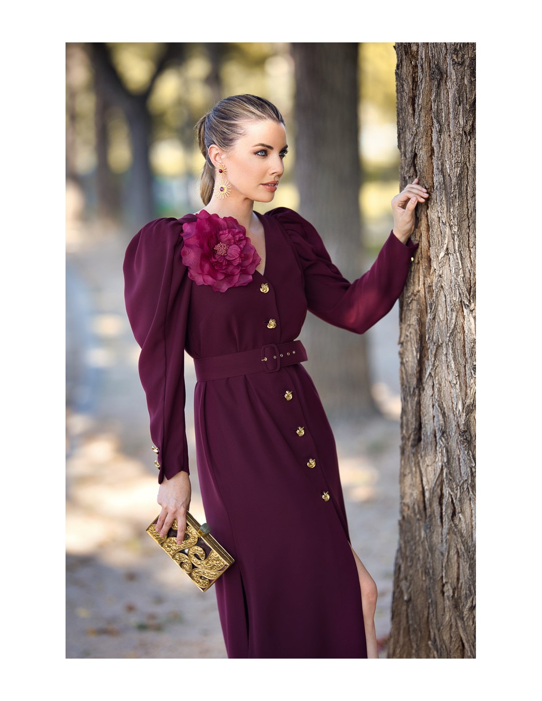 Este vestido midi desmontable con cinturón y detalle flor en color burdeos, se convertirá en uno de lo favoritos de la temporada. Realizado un tejido de alta calidad, con cinturón forrado en el mismo tejido y con mangas abullonadas desmontables. Estiliza la figura y favorece muchísimo a todo tipo de cuerpos. Incorpora también botones joya en el delantero y en las mangas. Un diseño de fondo de armario que no pasa de moda. Lleva forro, abertura lateral y un precioso broche de flor que podrás ponerte o quitarte según te pida el look.