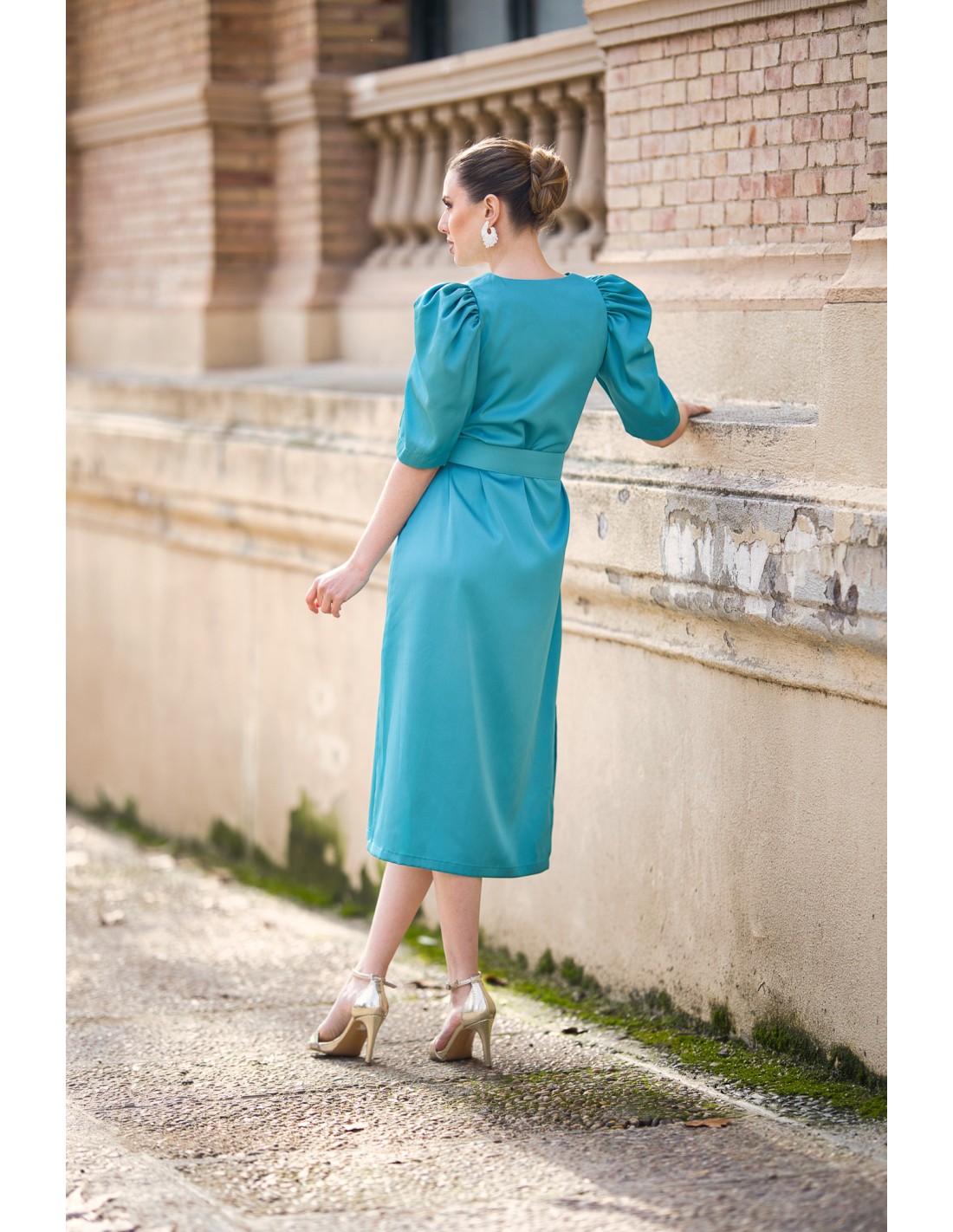 Vestido midi de raso con manga abullonada y cinturón