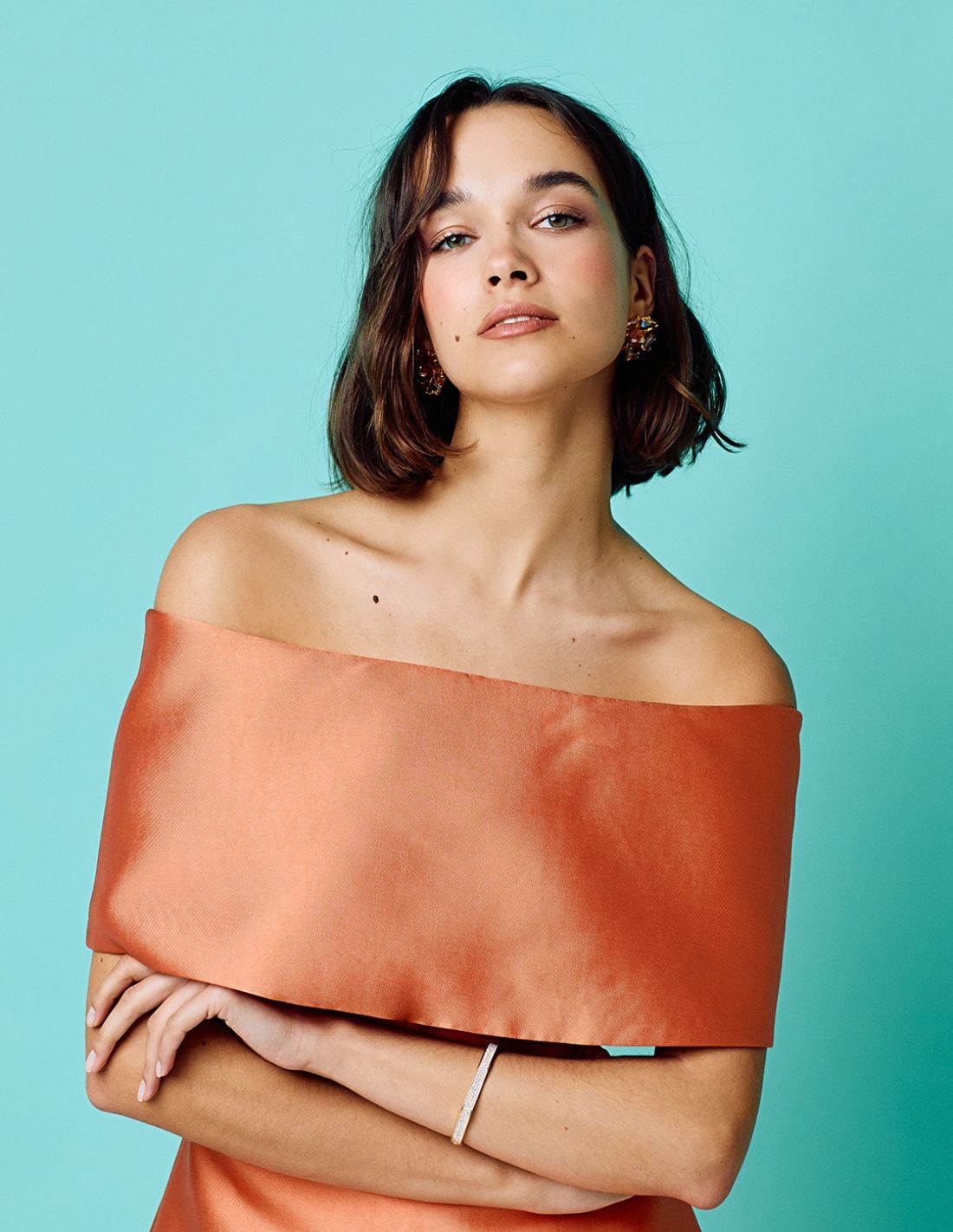 Este vestido midi de fiesta combina elegancia y estilo atemporal. Confeccionado en tejido mikado, destaca por su brillo y estructura, mientras que el forro 100% viscosa garantiza comodidad. Su diseño incluye un escote barco sin hombros, cintura ajustada para acentuar la figura y una abertura en el bajo que aporta movimiento y sofisticación.