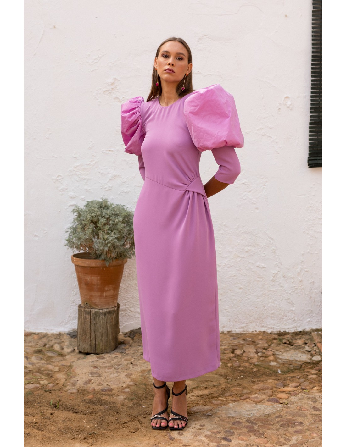 Este vestido midi lila en crepé fluido con detalles en tafetán en las mangas es la opción perfecta para eventos especiales. Su diseño midi y enterizo destaca por su cuello a la caja y un cuerpo suelto que se ajusta con un elegante nudo lateral, proporcionando una caída fluida y sofisticada.