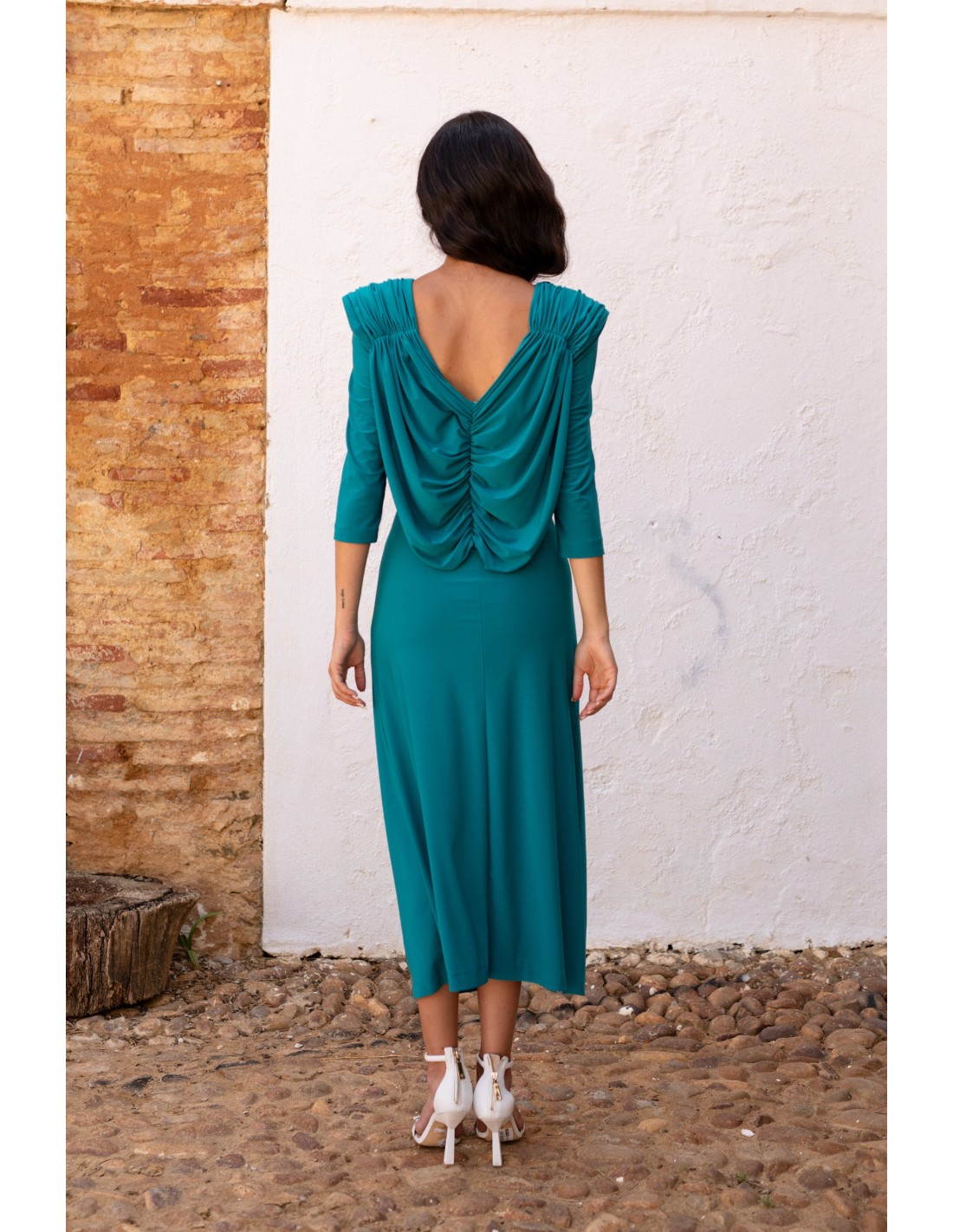 Deslumbra con este vestido midi de invitada verde turquesa, confeccionado en punto de seda, un tejido elegante y favorecedor que se adapta al cuerpo con un ajuste impecable. Su escote en V y mangas tres cuartos aportan sofisticación, mientras que los fruncidos en los hombros y torso estilizan la figura de manera excepcional.