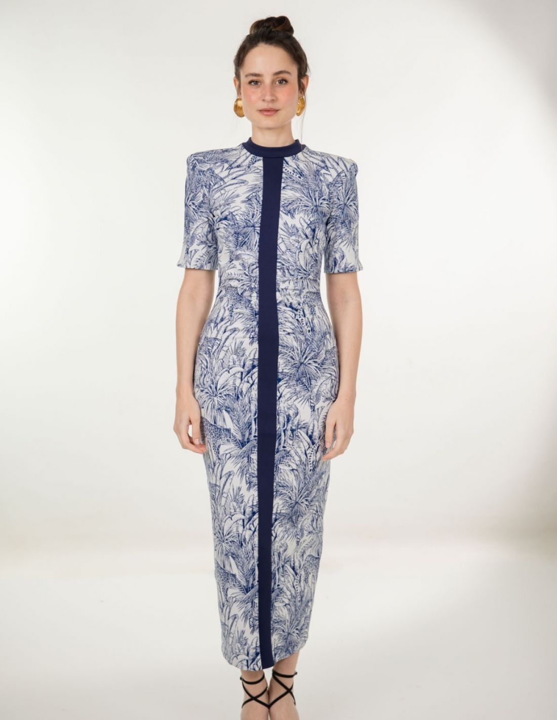Este vestido midi de punto neopreno con estampado de selva en tonos azules es una pieza atrevida y sofisticada que destaca por su originalidad. Su cuello alto, manga corta con hombrera maxi y silueta estructurada crean un look potente, ideal para mujeres con personalidad.