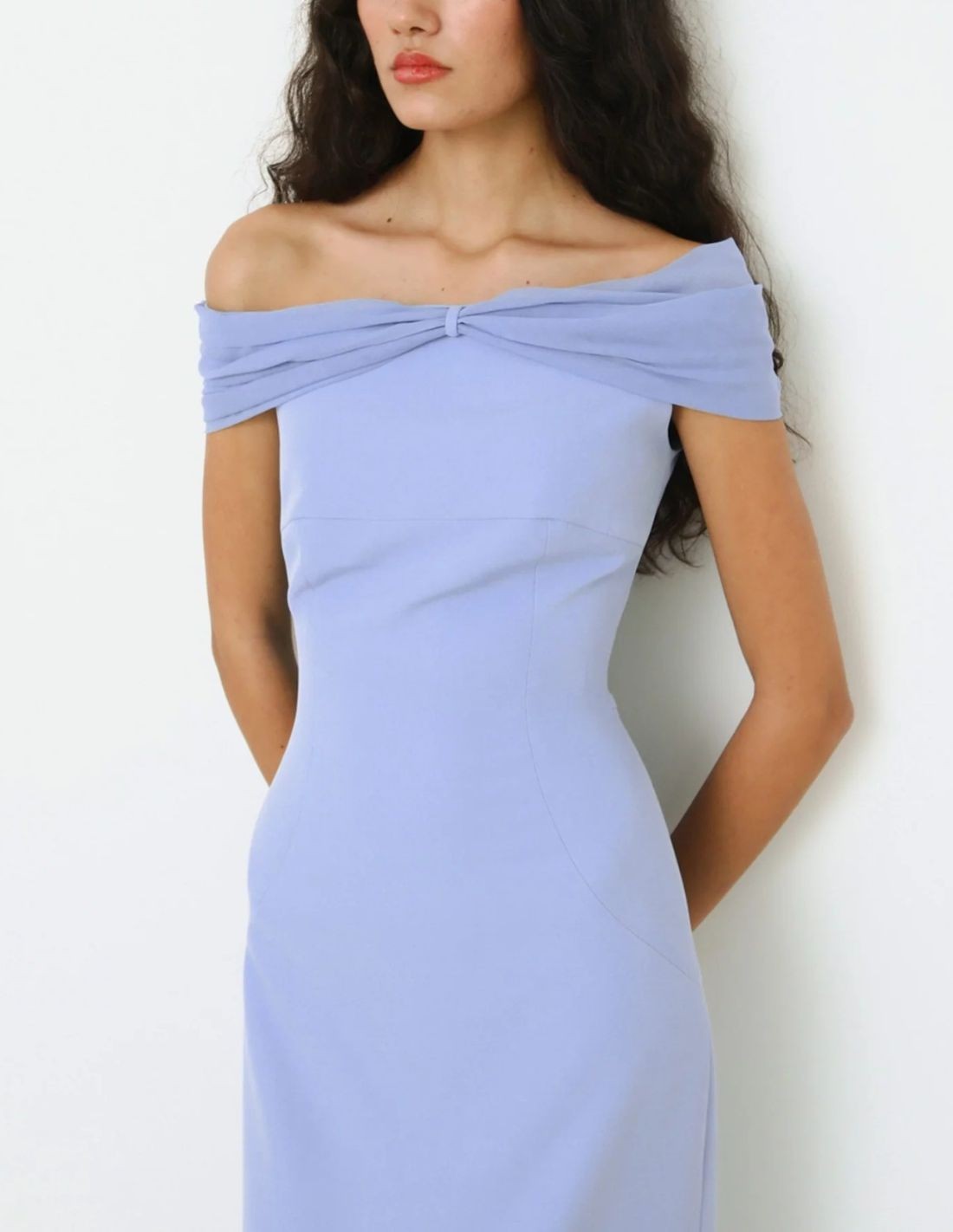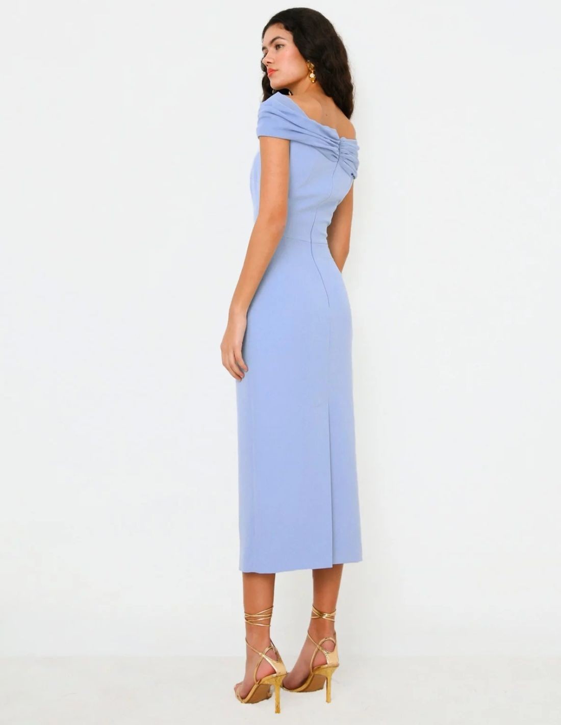 Vestido midi de fiesta azul con escote bandeau drapeado