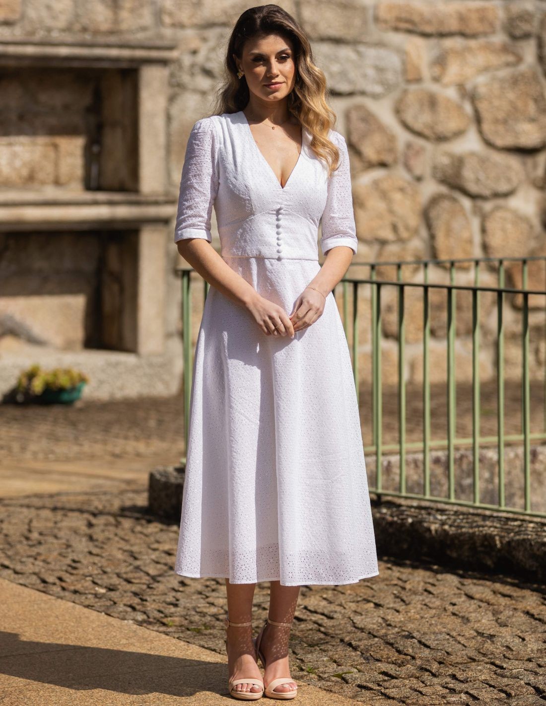 Vestido midi blanco con bordados y manga francesa
